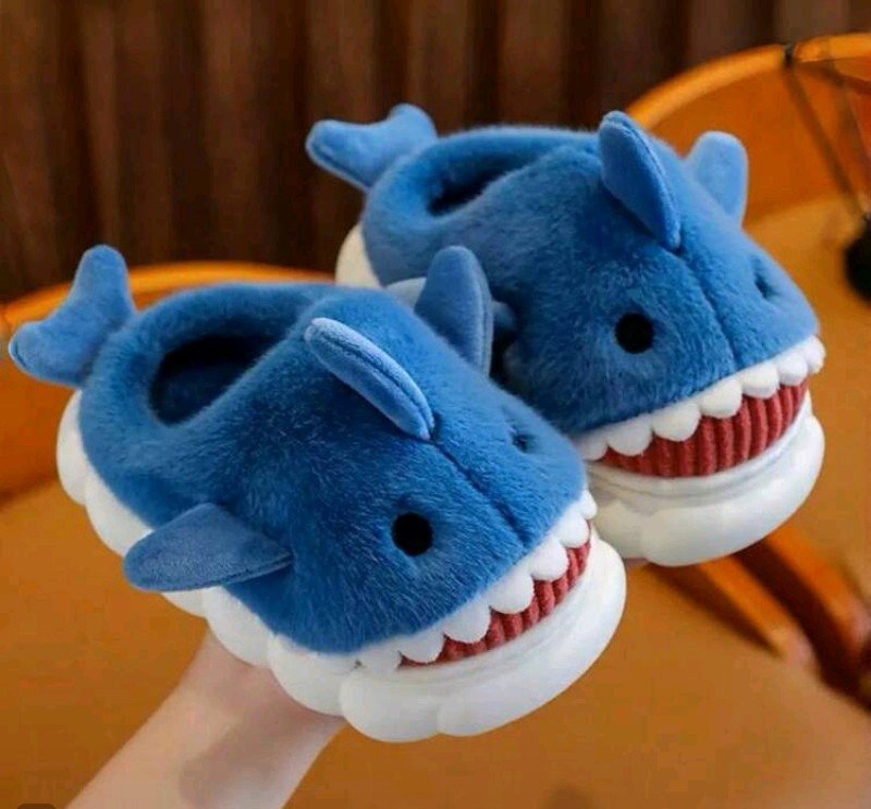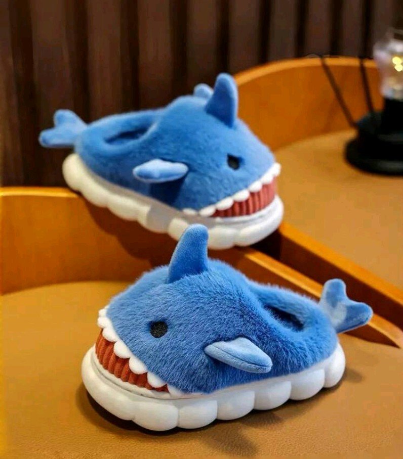 شبشب حراري لطيف للاطفال بنقشة سمكة قرش كرتونية من الفرو السميك للاولاد والبنات