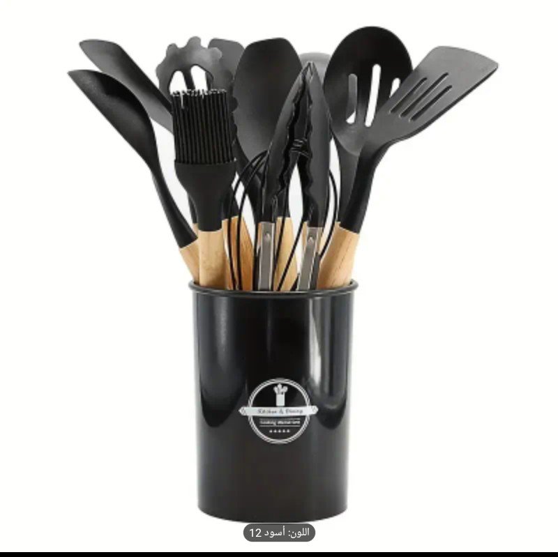 طقم أدوات مطبخ سيليكون بمقابض خشبية 12 قطعة – أدوات طهي مقاومة للحرارة، مواد غذائية آمنة، يتضمن ملعقة، خفاقة، مصفاة، مقلاع، ملاقط، والمزيد – مع رف تخزين، تصميم متين وموفر للمساحة للمنزل والمهني