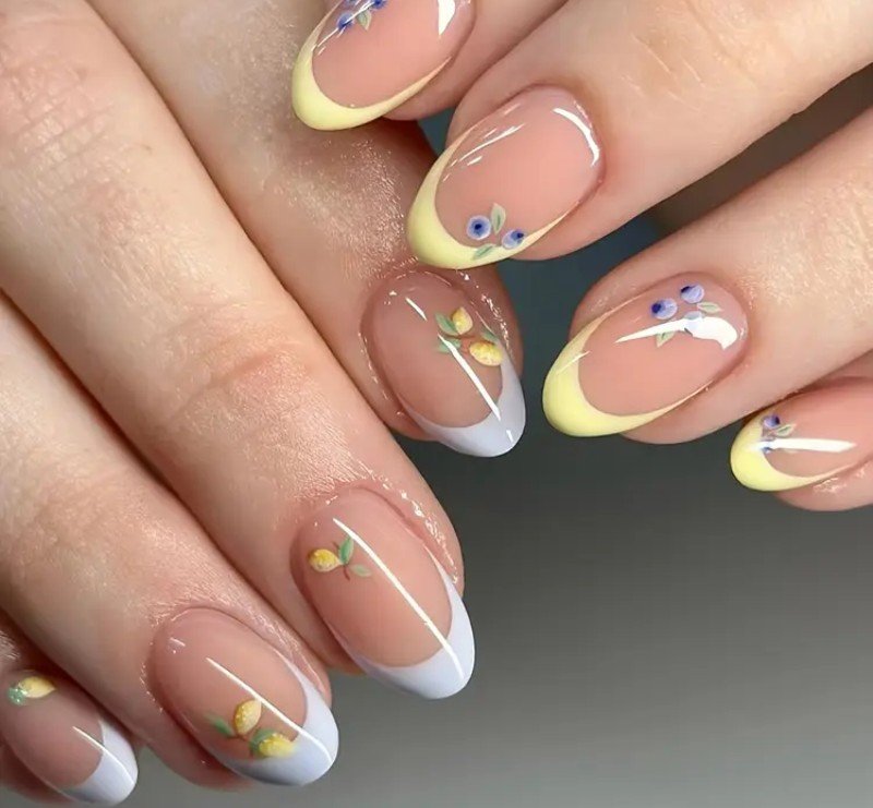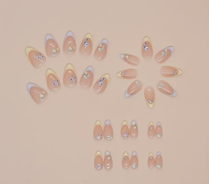 30 قطعة من أظافر اللوز القابلة للارتداء مع زهور صغيرة وأوراق خضراء، مع غراء جيلي ومكشطة الأظافر