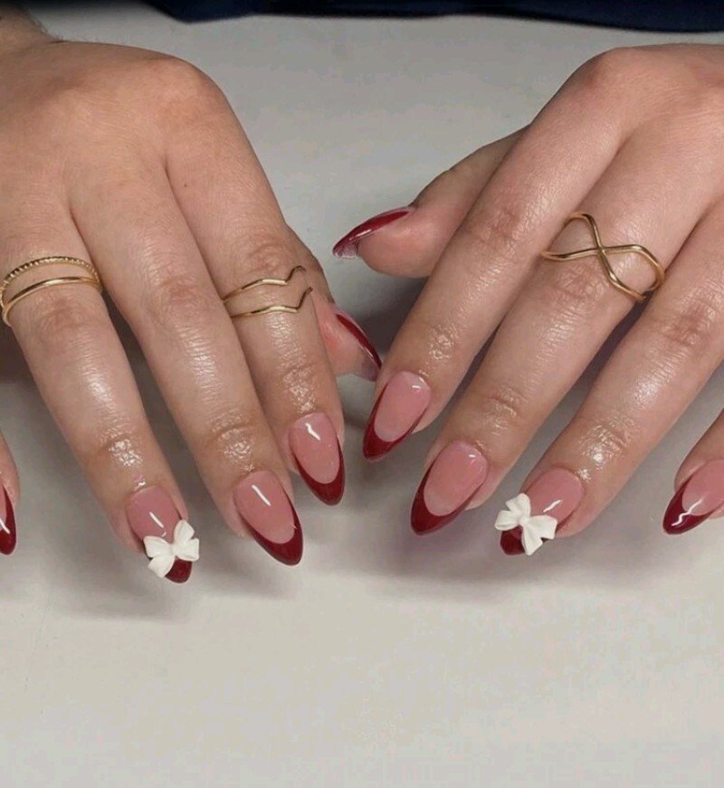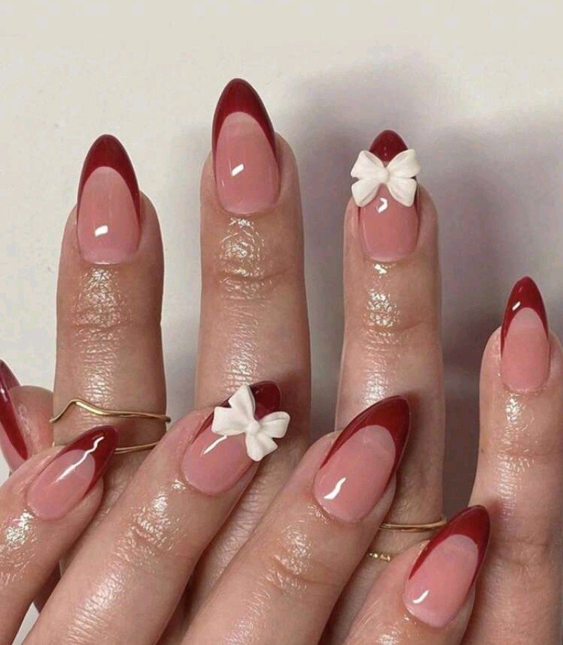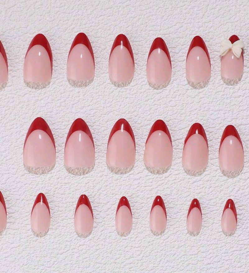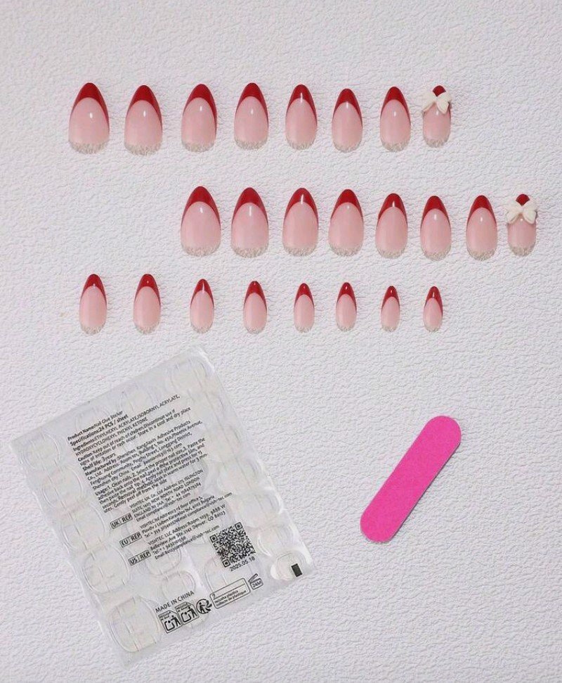 24 قطعة أظافر وهمية قصيرة بشكل اللوز باللون الوردي مزينة بفيونكة بيضاء ثلاثية الأبعاد، طرف فرنسي أنيق باللون الأحمر، تشمل ملف أظافر واحد وملصق لاصق ثنائي الجانب، مناسبة للبنات/النساء في الحفلات والعطلات والهدايا أو ارتداء المكاتب