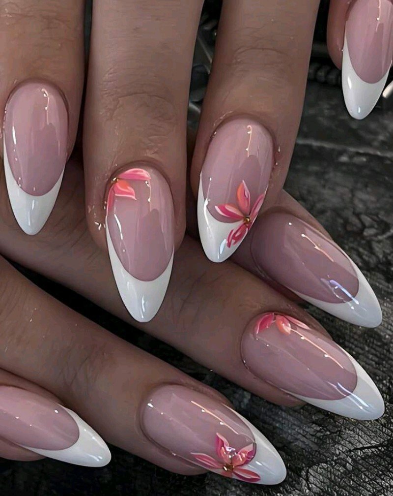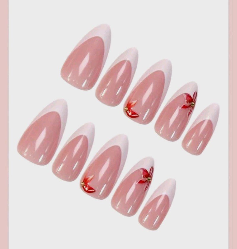 24 قطعة ملصقات أظافر بشكل اللوز المتوسط، تصميم فرنسي أبيض، بنقشة زهرية، مزينة بالراين ستون، بطراز بسيط، تغطية كاملة، مناسبة للنساء والفتيات في الصيف، مستلزمات فن الأظافر.