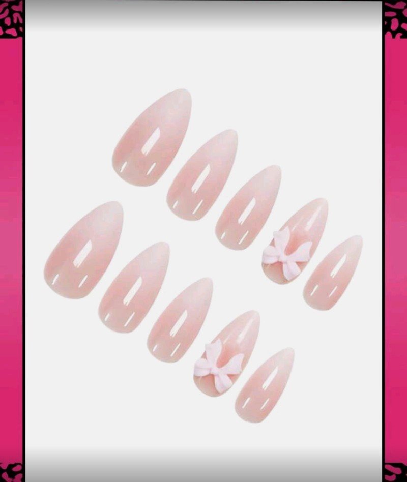 + Free Shipping24 قطعة أظافر صناعية لامعة بلون وردي على شكل لوز مع فيونكة ثلاثية الأبعاد وقلوب مرصعة بالراين – أظافر ضغط متوسطة الطول للنساء، مجموعة مانيكير لامعة للزفاف، الحفلات، الحفلات الراقصة، الملابس اليومية – تطبيق سهل