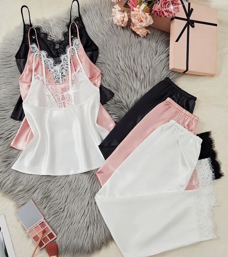 + Free Shippingمجموعة بيجاما نسائية أنيقة مكونة من 6 قطع مع حواف دانتيل متباينة – ياقة V، قميص بدون أكمام بحمالات، بنطلون مطاطي، مزيج من البوليستر الناعم، مثالية لفصل الربيع/الصيف، ملابس نوم صيفية|قميص برقبة V|قصة مريحة