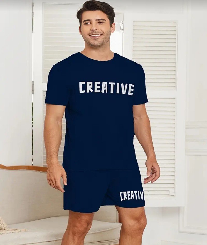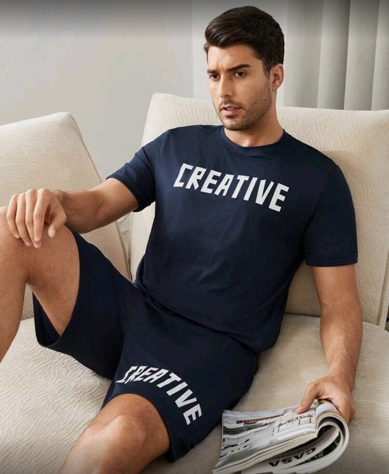 طقم بيجامات رجالية بطباعة  بأسلوب بسيط، طقم قمصان بأكمام قصيرة وياقة مستديرة وشورت، طقم بيجامات مريحة وعصرية وخفيفة الوزن للرجال