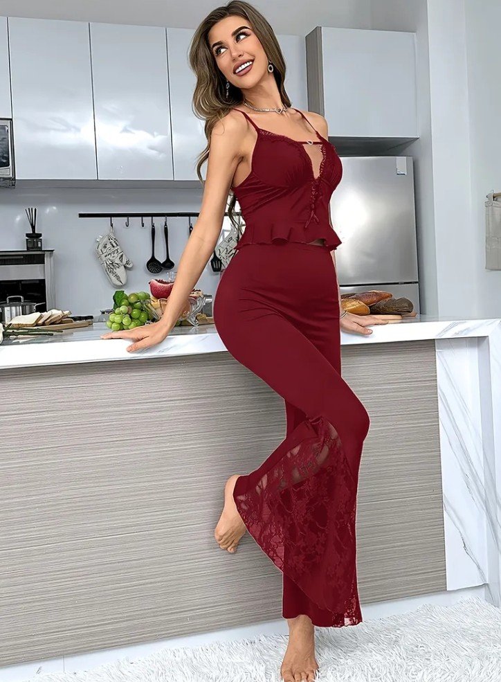 + Free Shippingطقم بيجامة أنيق من الدانتيل بأكمام رفيعة | فتحة رقبة على شكل حرف V، بدون أكمام، بنطلون طويل، بدون ظهر، لون موحد، مثالي للبالغين، مثالي للربيع/الصيف