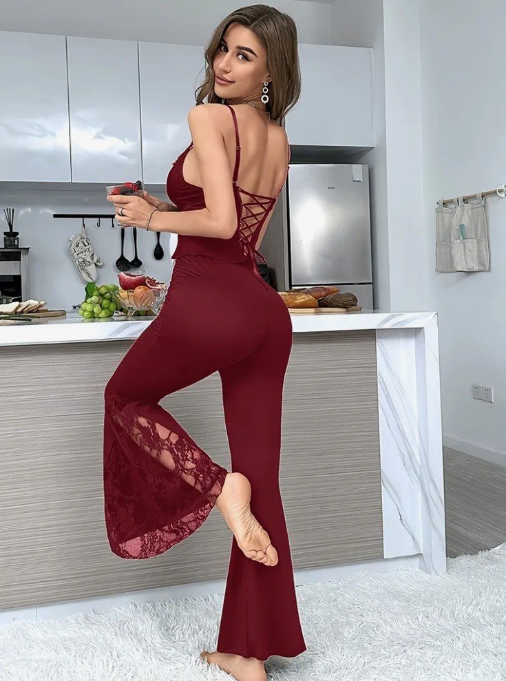 طقم بيجامة أنيق من الدانتيل بأكمام رفيعة | فتحة رقبة على شكل حرف V، بدون أكمام، بنطلون طويل، بدون ظهر، لون موحد، مثالي للبالغين، مثالي للربيع/الصيف