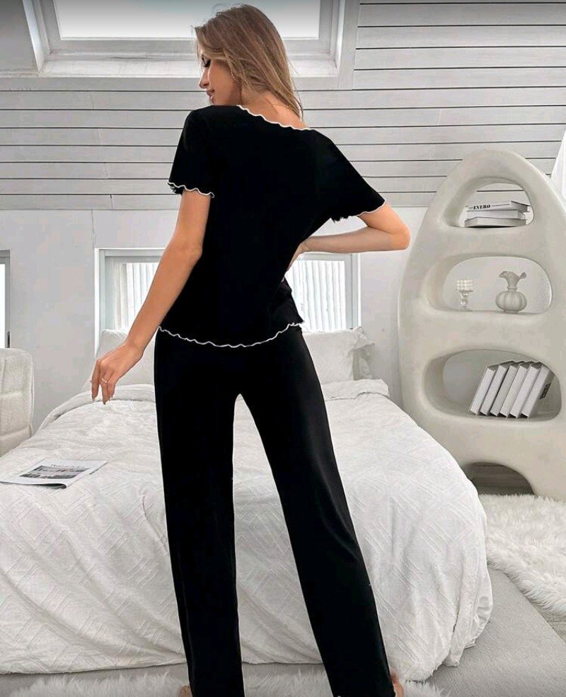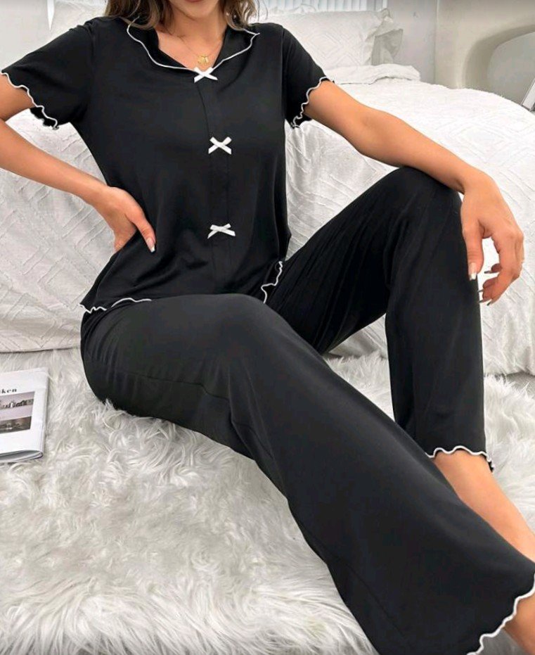 + Free Shippingملابس منزلية نسائية جديدة بلون صلب كاجوال بسيط برقبة على شكل حرف V وأكمام قصيرة مزينة بقوس لطيف بنطلون طويل مجموعة من قطعتين