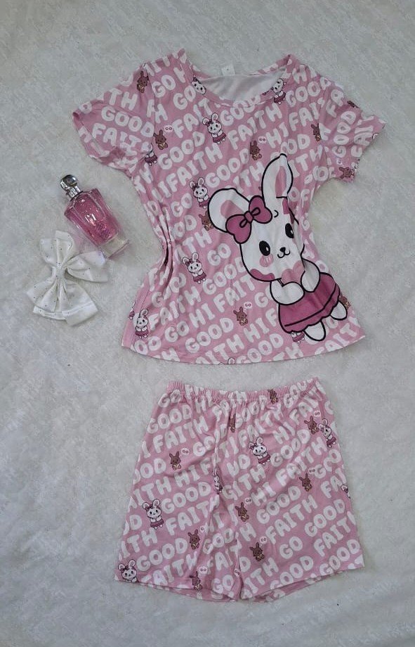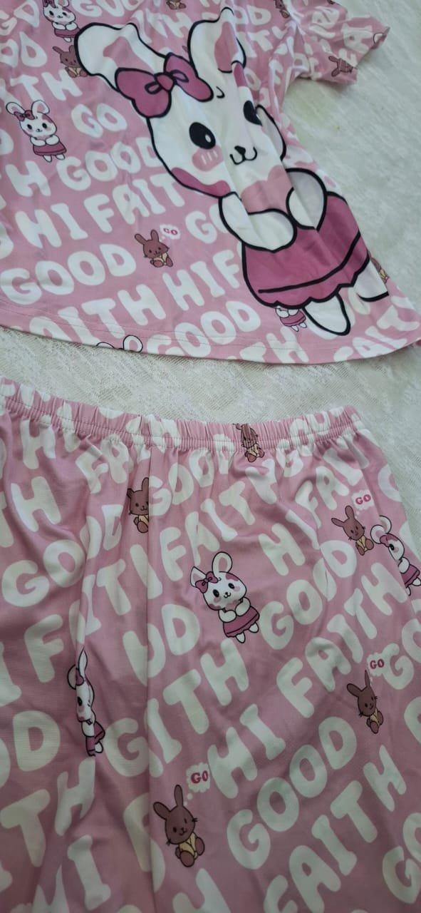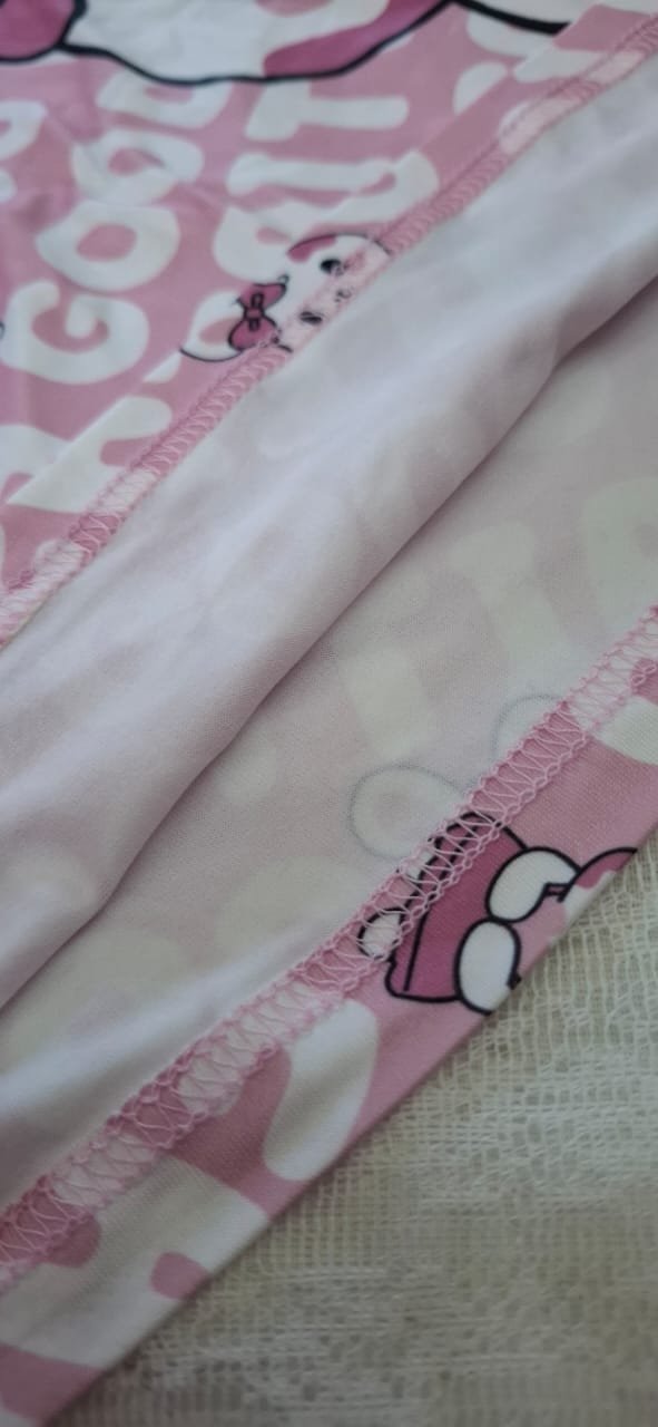 بيجامه بناتي هيلو كيتي رسمة كرتونية وحروف عشوائة ، تتميز بياقة دائرية وأكمام قصيرة وشورت، مثالية لطقم ملابس استرخاء لطيف وعصري
