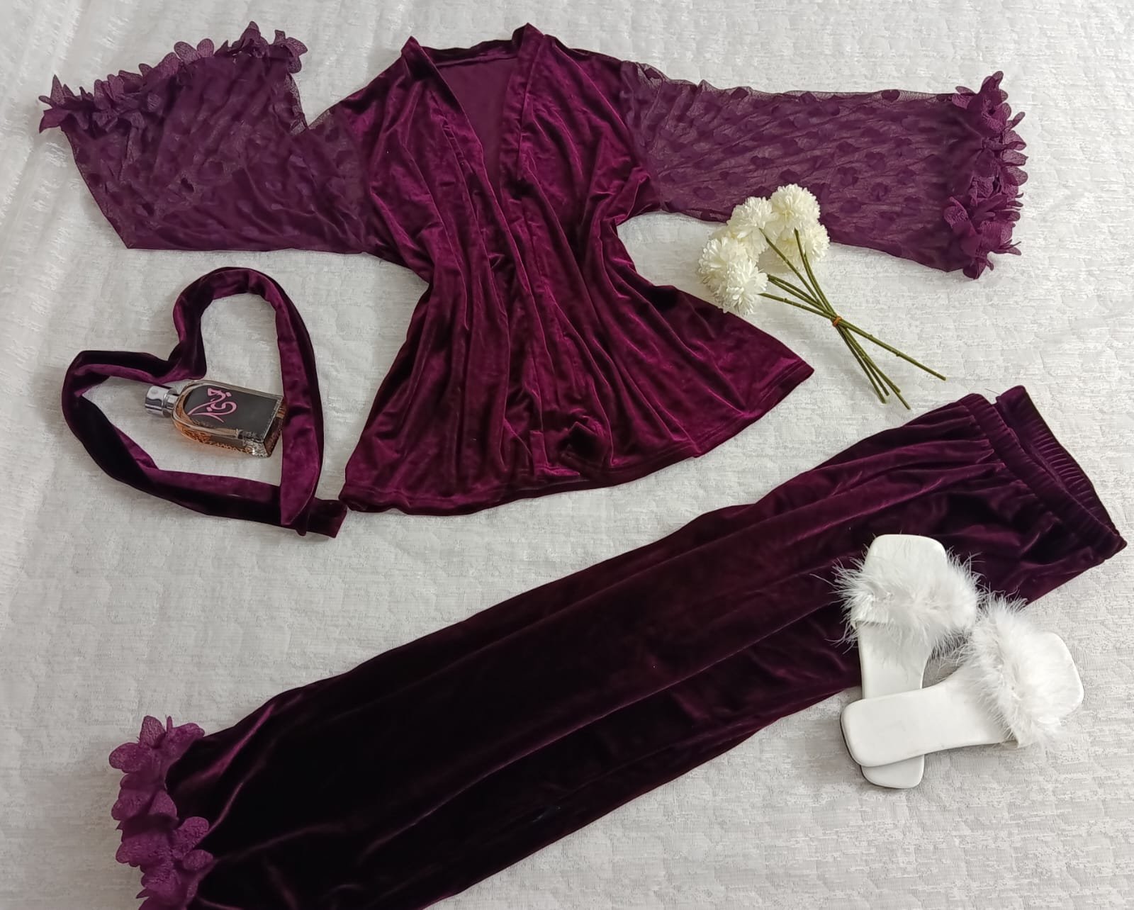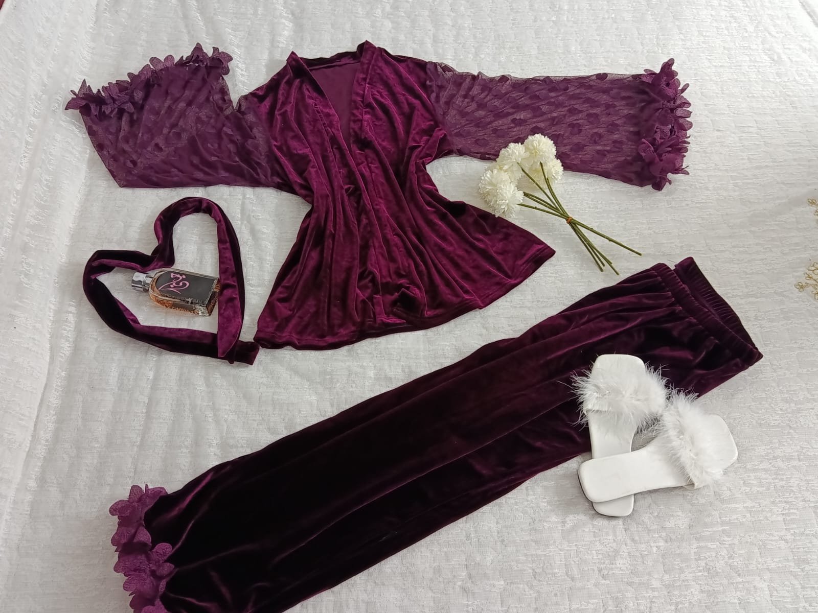 طقم بيجاما مخملي أنيق من كوتيسوار للنساء، مطرز بالدانتيل، طقم ملابس نوم مخملي بلمسة فرنسية ساحرة، طقم بيجاما فاخر مزين بالدانتيل، ملابس خريف وشتاء