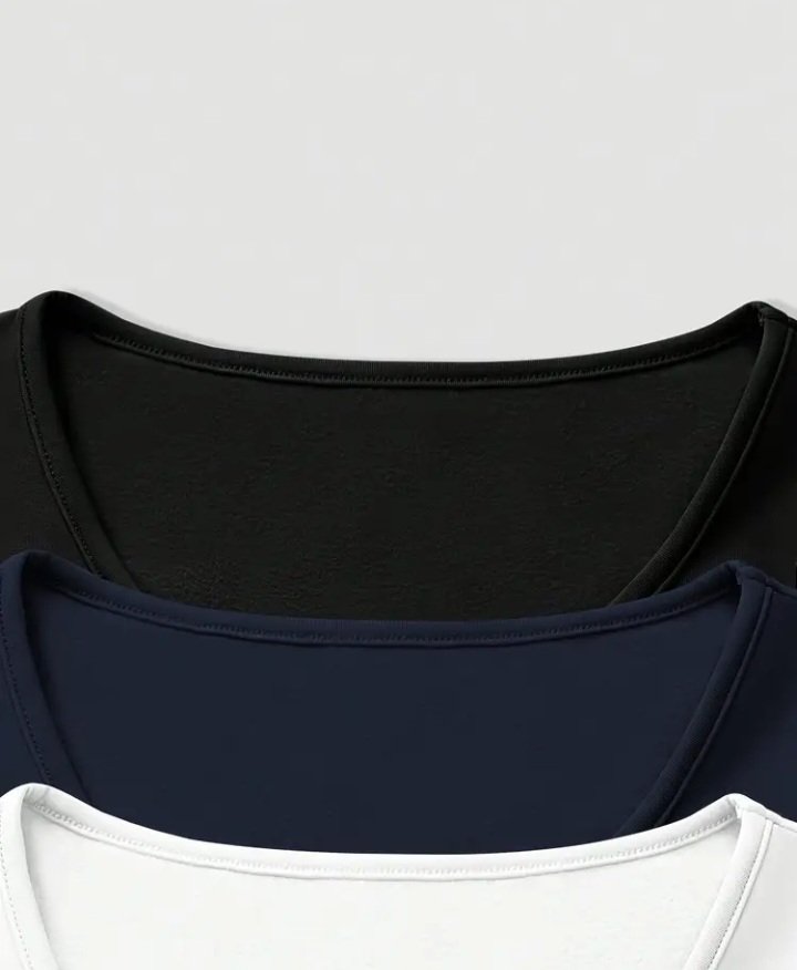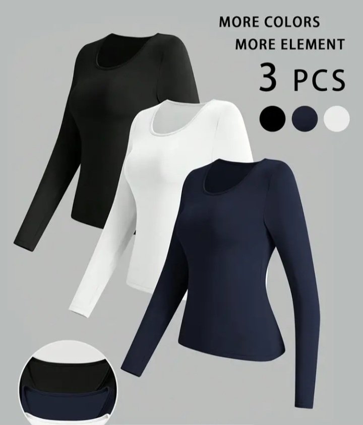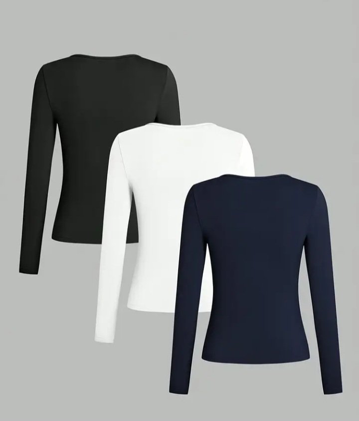 3 قطع بلوزات محبوكة للبنات بلون سادة ورقبة مستديرة – توبات طويلة الأكمام بتصميم ضيق مناسبة للعب والملابس اليومية – قطع طبقات ناعمة قابلة للغسيل في الغسالة