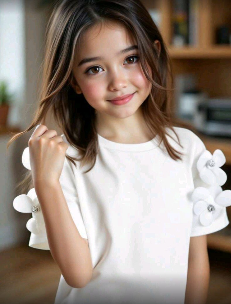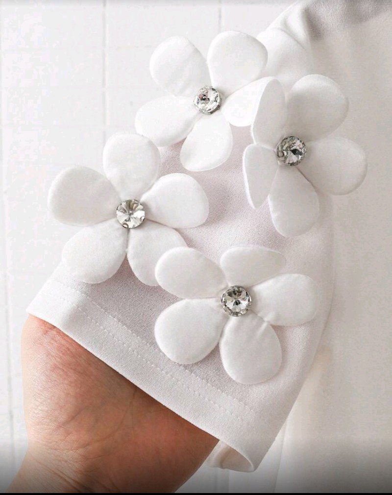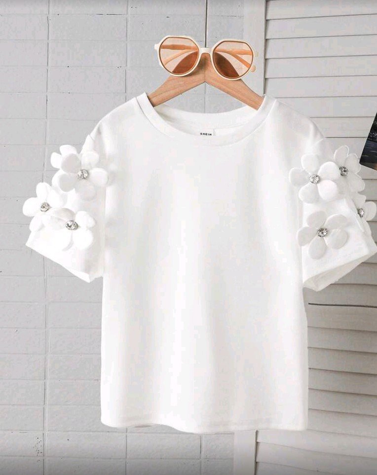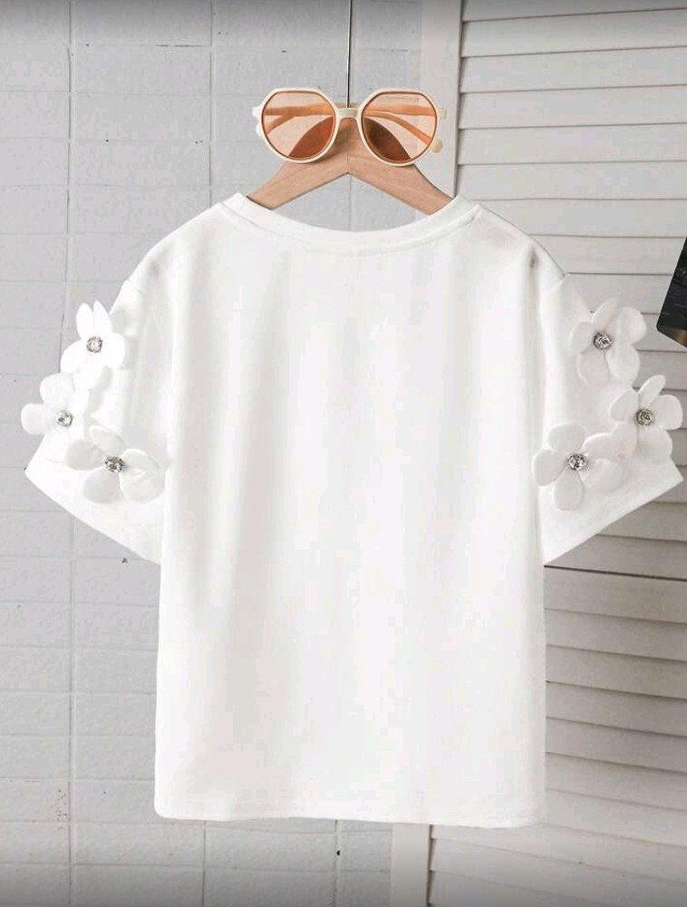 بلوزة قصيرة الأكمام ضيقة برقبة دائرية مزينة بنقوش زهور ثلاثية الأبعاد، مناسبة للفتيات الصغيرات  بتصميم كاجوال أنيق، مثالية للعطلات.