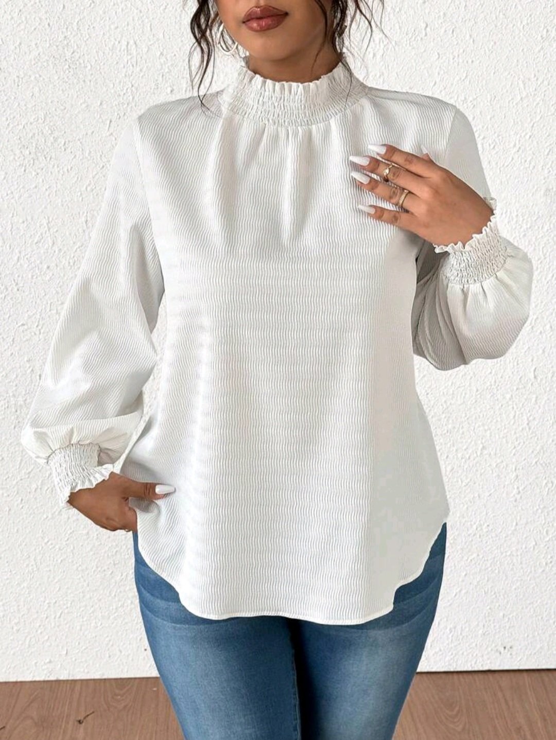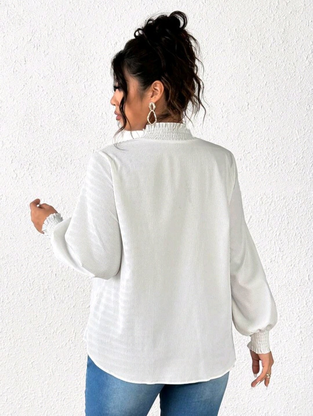 + Free Shippingموضة الياقة ذات اللون السادة بمقاس كبير بلوزة باكمام طويلة ومزخرفة