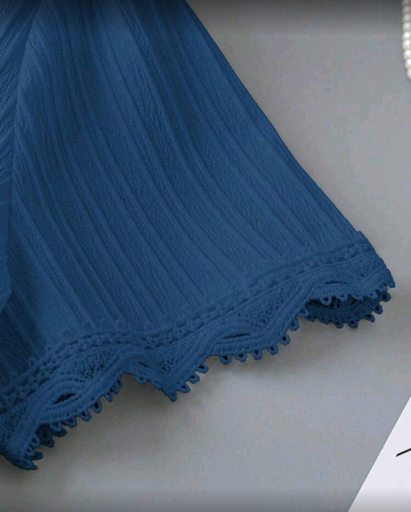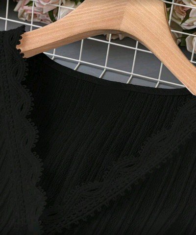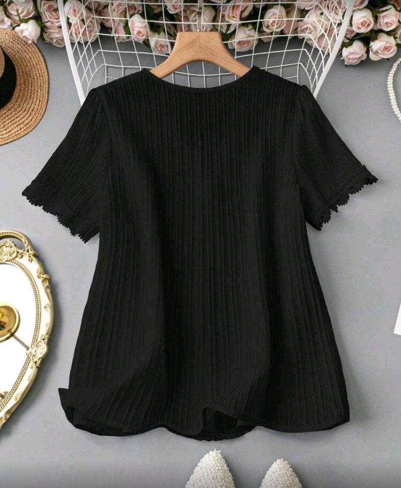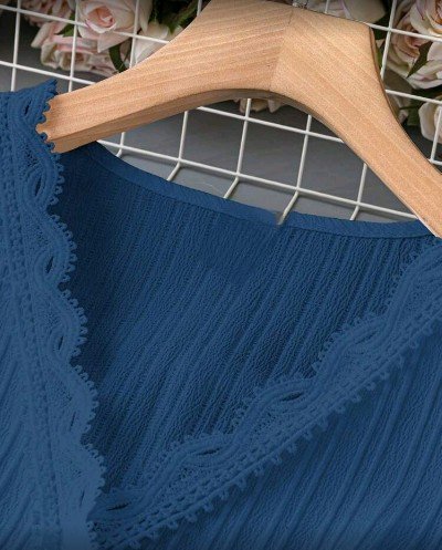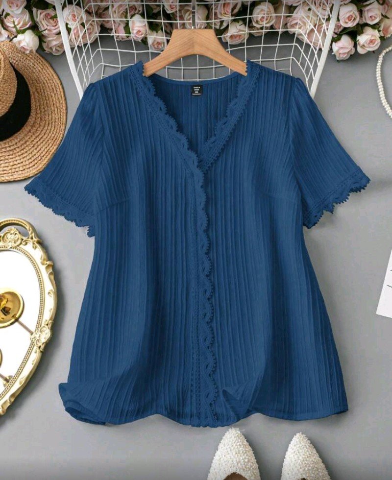 + Free Shippingبلوزة ستاتي فضفاض باكمام قصيرة من الدنتيل على شكل حرف V