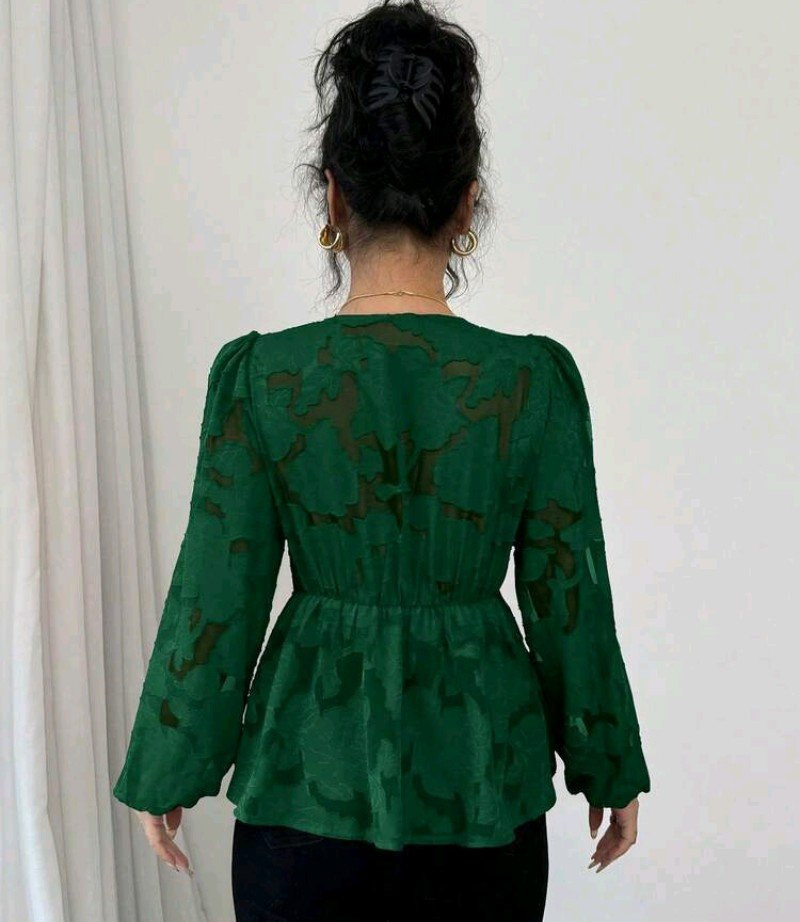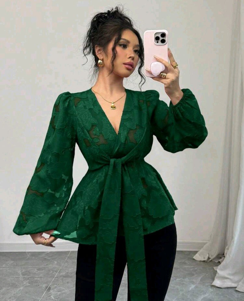 قميص بلون موحد للربيع والصيف، بقصة فضفاضة، وتفاصيل ربطة عنق، وأكمام طويلة.