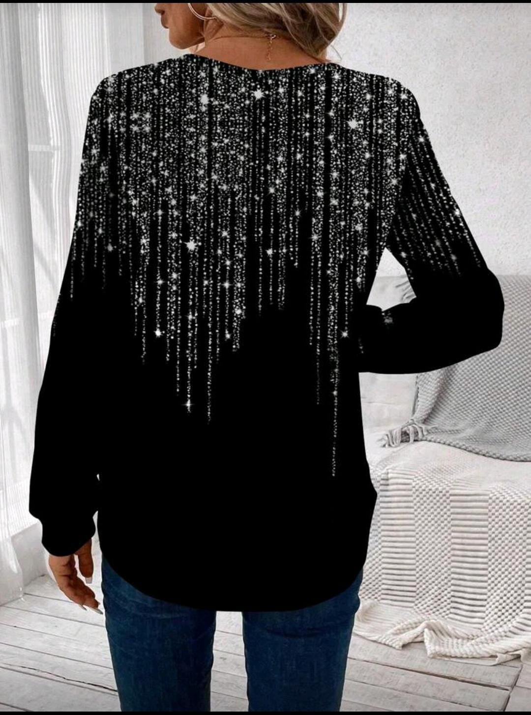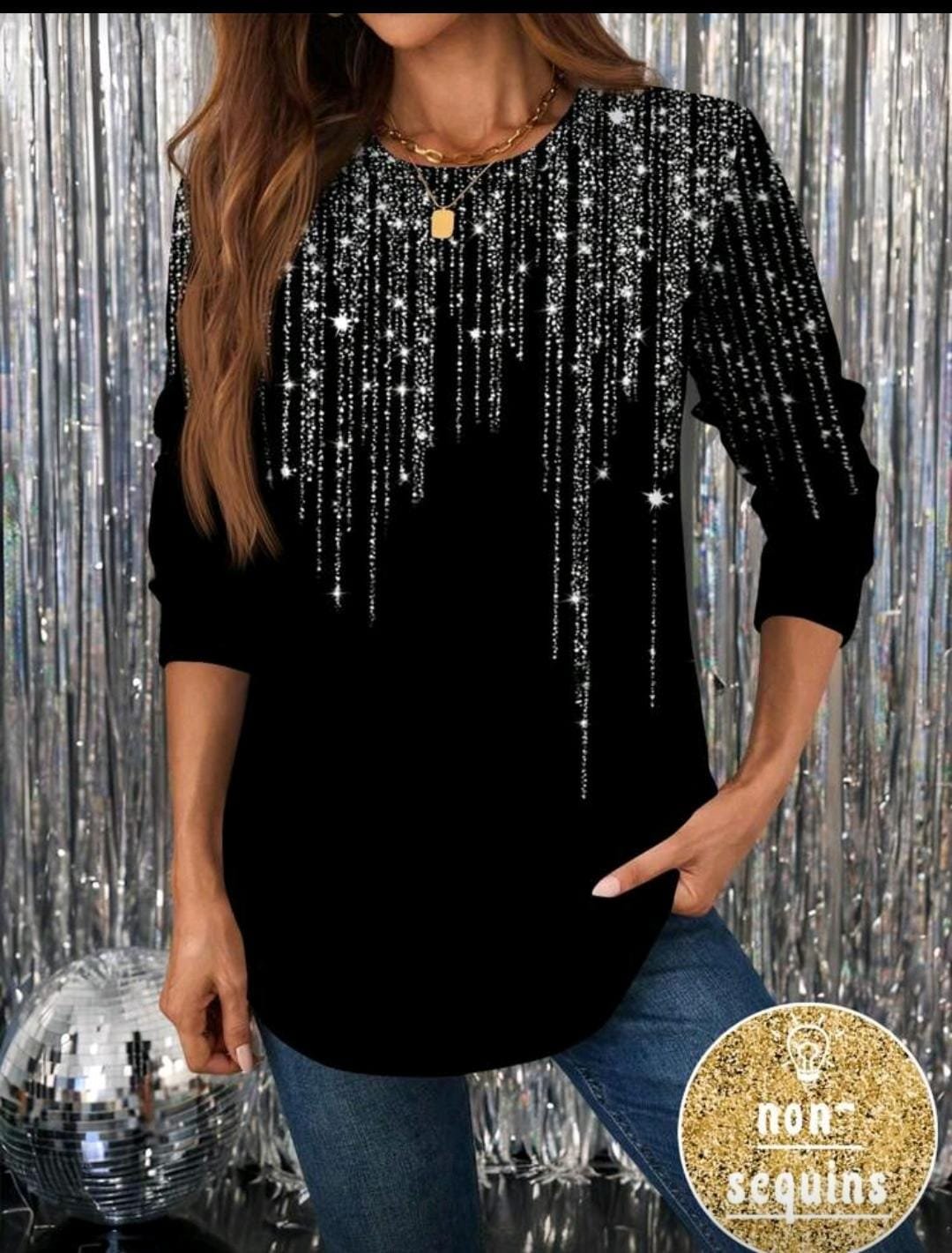 بلوزة بتصميم بسيط كاجوال لامع وترتر فضفاض واكمام طويلة