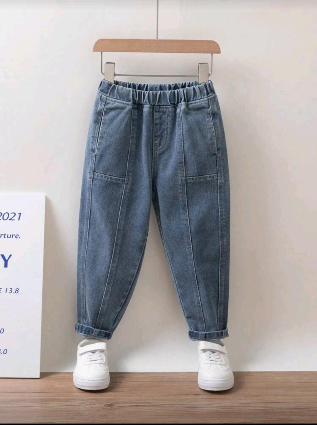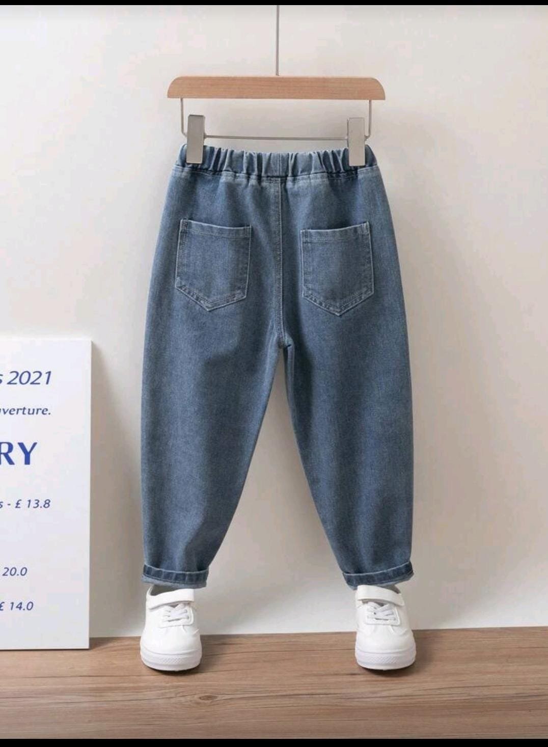 بنطال للاولاد بنمط كاجوال بلون السادة وخصر مطاطي من قماش الدنيم