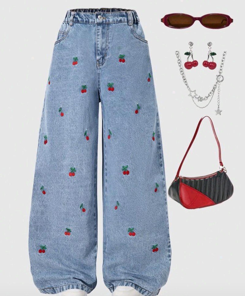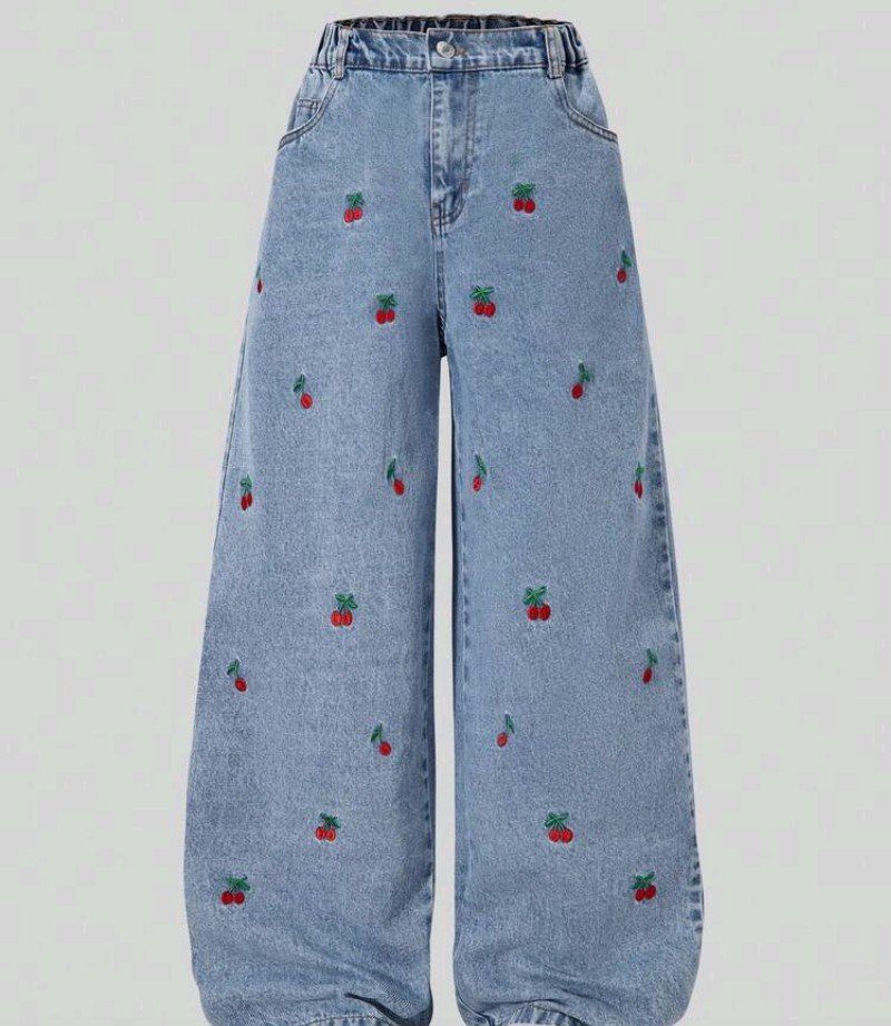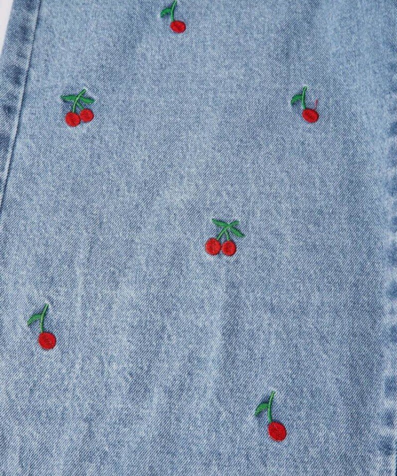 + Free Shippingبنطلون جينز كاجوال بتصميم كرزة تطريز بقصة مستقيمة للبنات