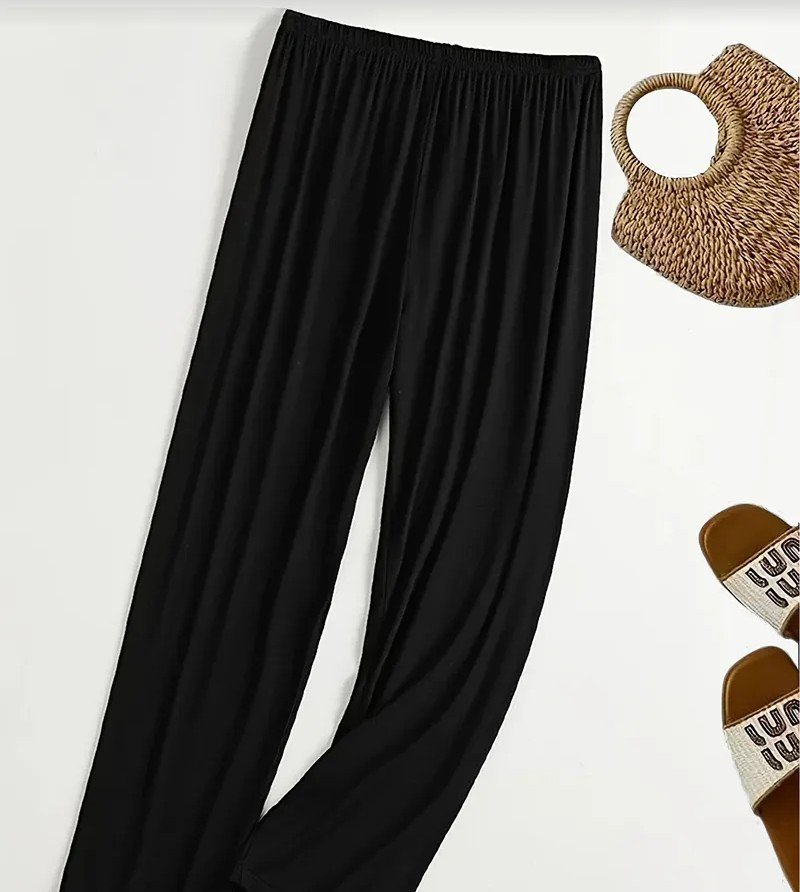 + Free Shippingحجم كبير – بنطلون نسائي واسع الساق عالي الخصر – أسود صلب، حزام خصر مطاطي، عارضة وأسلوب، مزيج بوليستر مريح، قابل للغسل في الغسالة، سراويل ضيقة عالية الخصر
