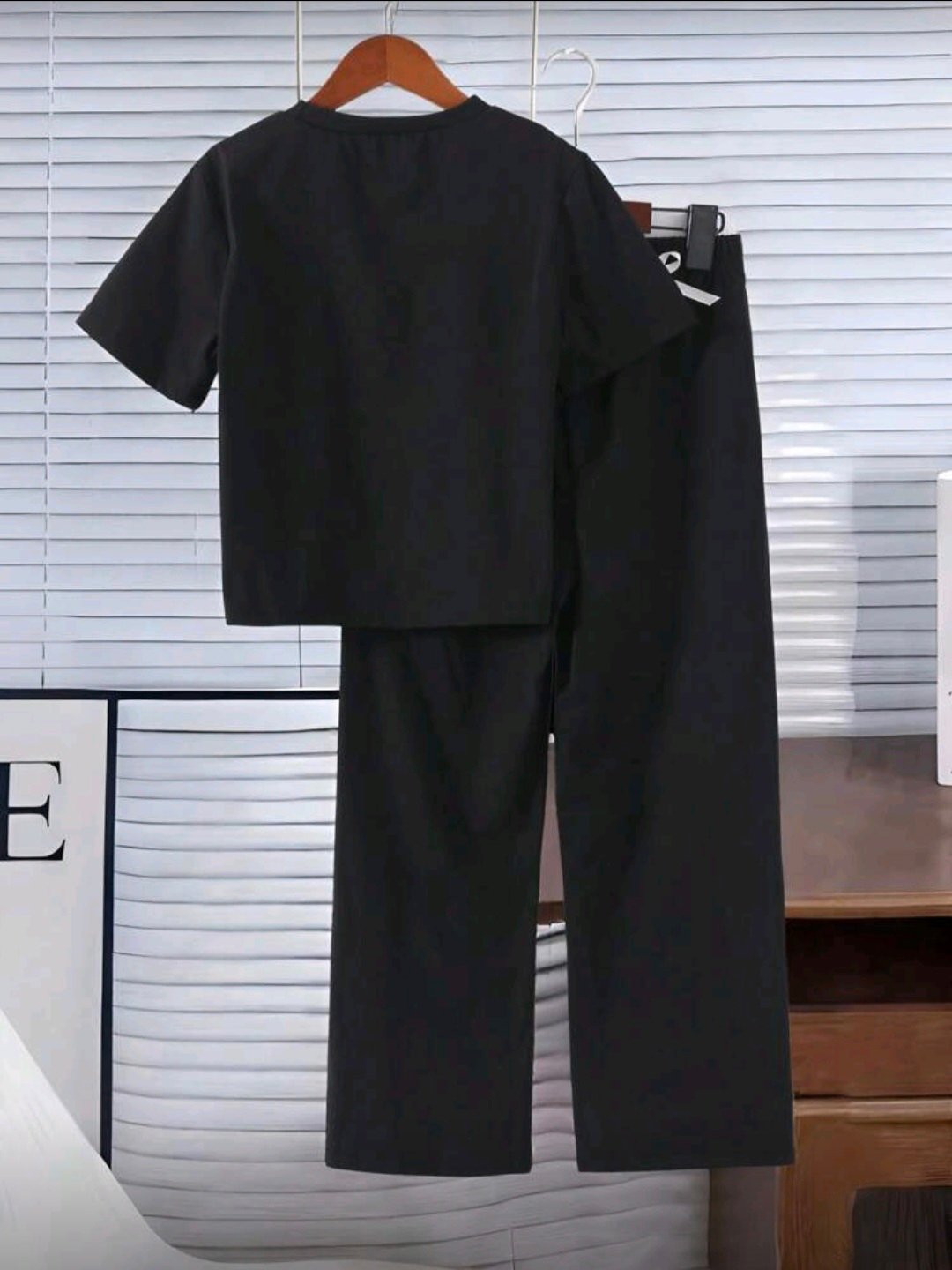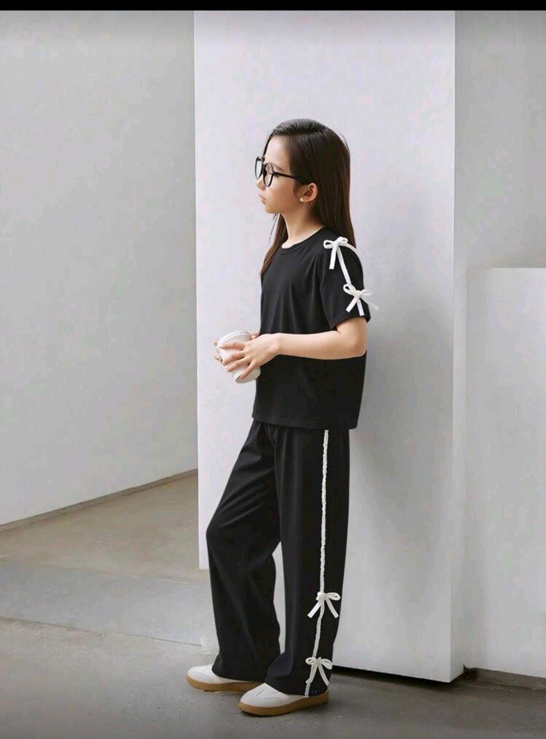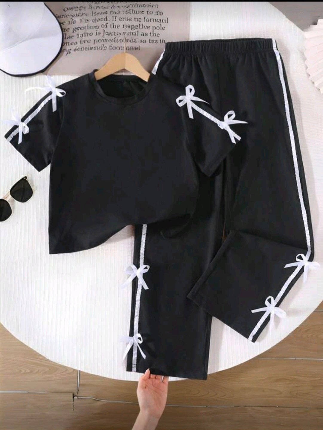 طقم صيفي مكون قطعتين تيشيرت اسود مزين بورة الفيونكه فضفاضه ومريحه وبنطال فضفاض ومريح