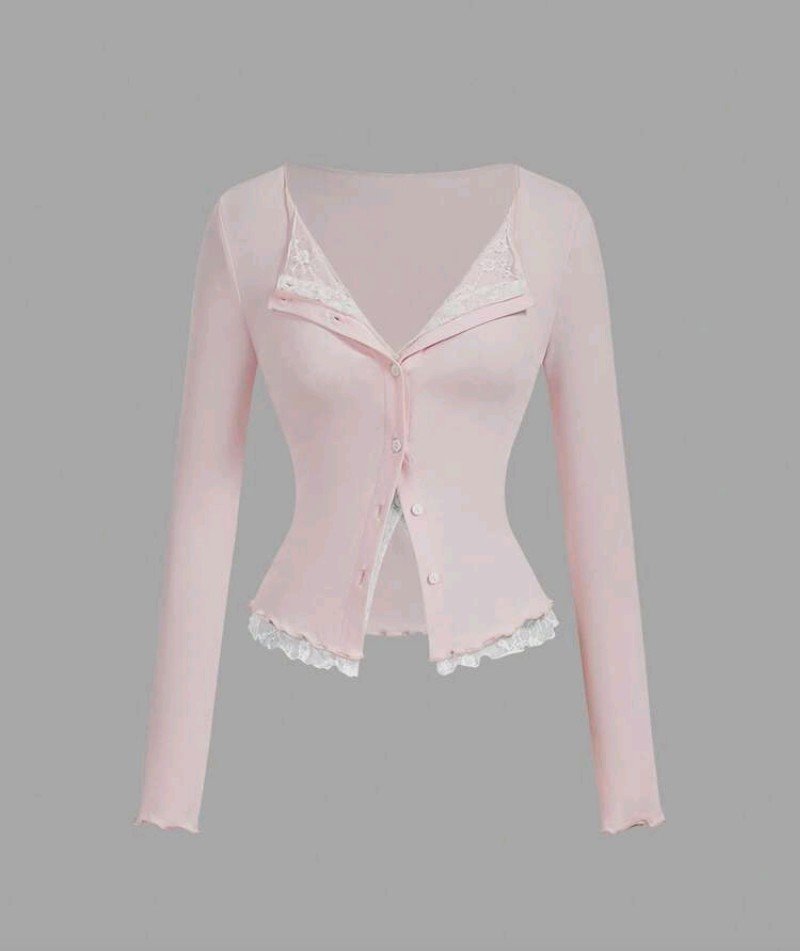 ملابس علوية نسائي بأكمام طويلة ضيق مع تصميم لحاء الدانتيل باللون المتباين، ملابس علوية وردي، صيفي للنساء، للنساء، رأس السنة الجديدة، ملابس علوية نسائية أنيقة، مجموعة عصرية، حافة دانتيل، تصميم 2 في 1، رقبة على شكل V، نساء العطلات، حفلة، عيد الحب للنساء، ربيع النساء