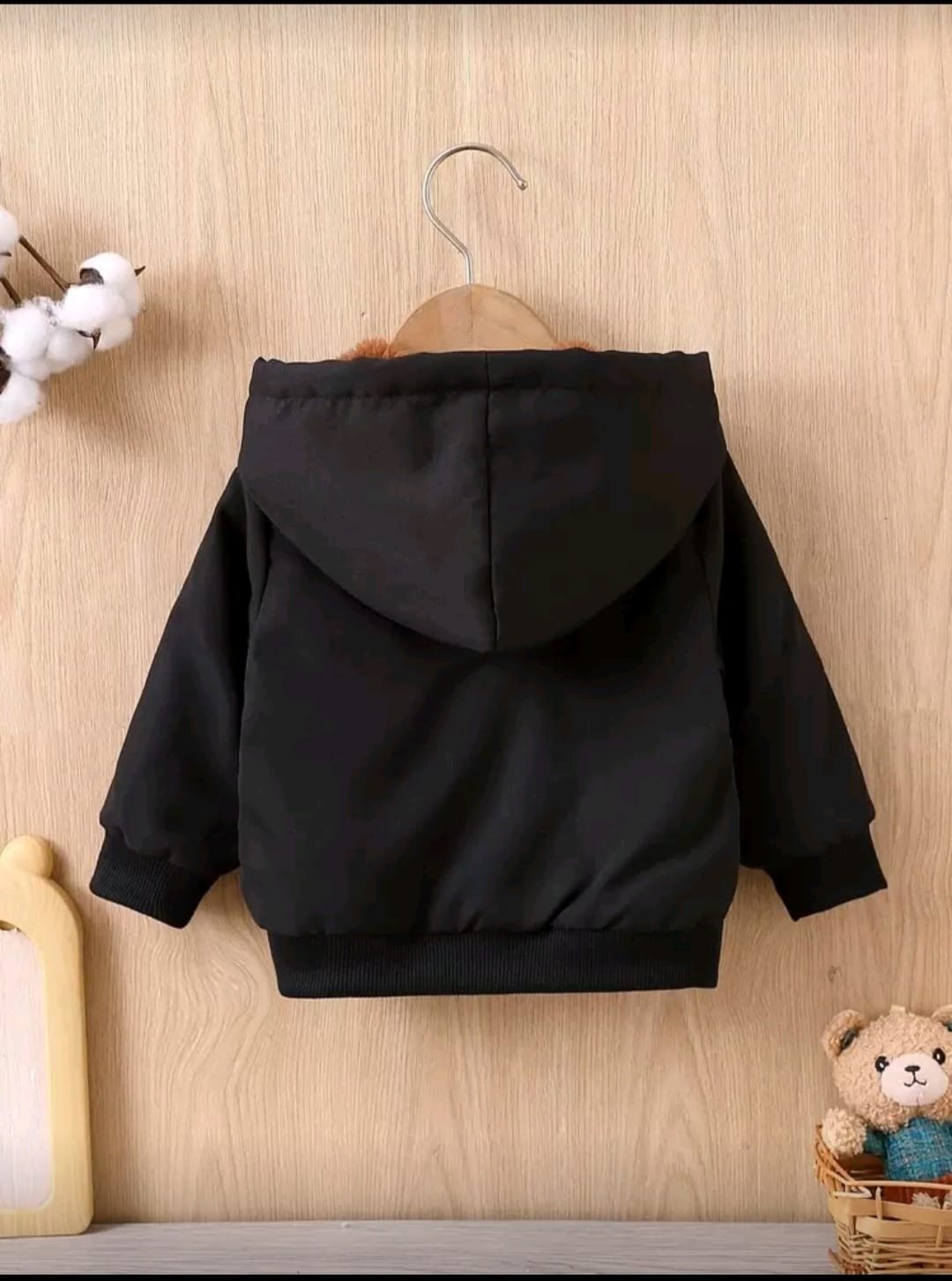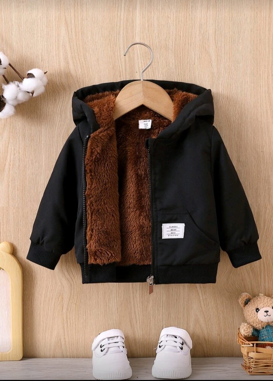 + Free Shippingجاكيت بغطاء رأس وسحاب مبطن بفرو ناعم للاطفال مزين بتفاصيل حروف مرقعة.