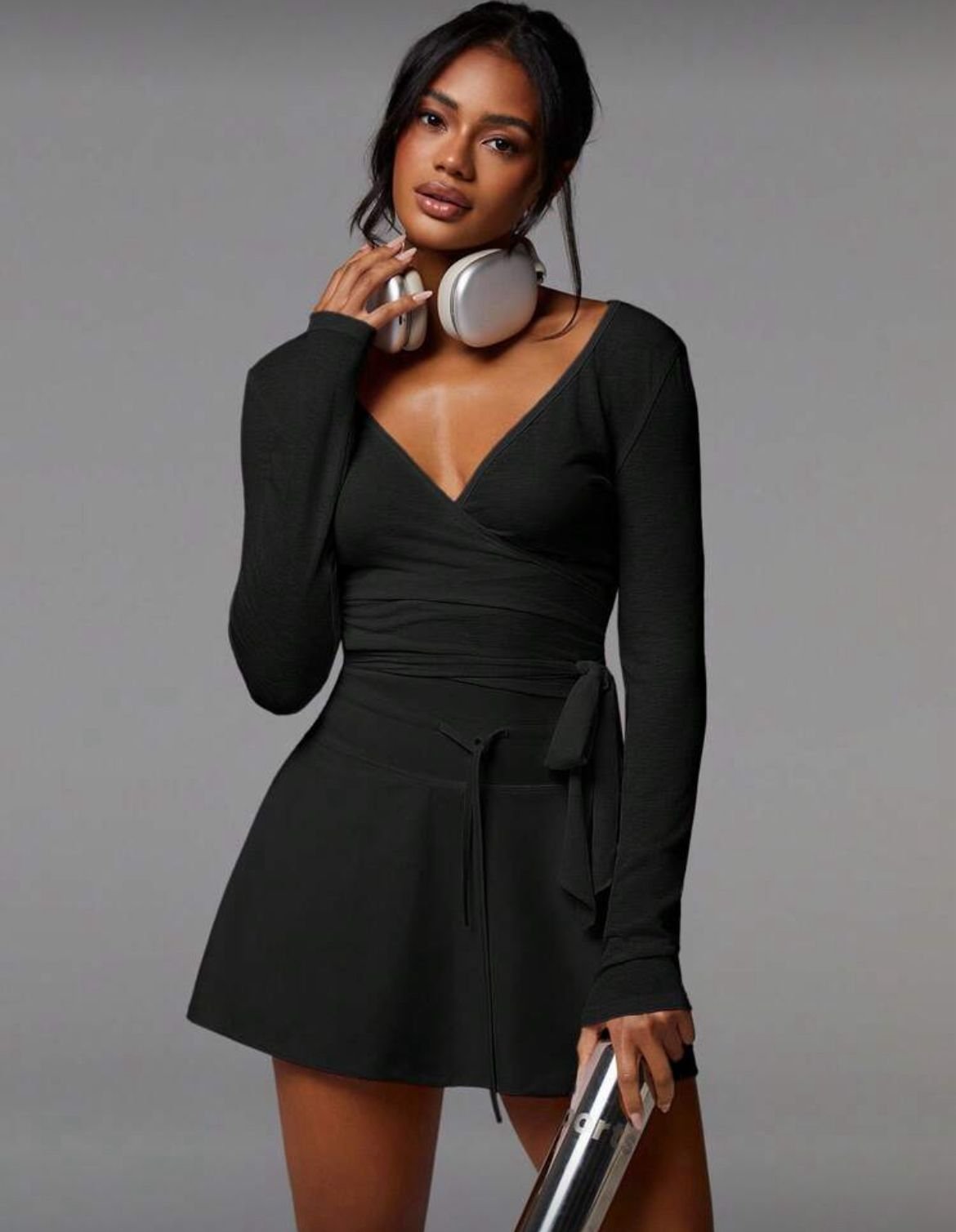 جكيت نسائية أنيقة بلون موحد، بتصميم متقاطع ملفوف حول الكتفين، وأكمام طويلة منسدلة، وقصة ضيقة، باللون الأسود.والابيض