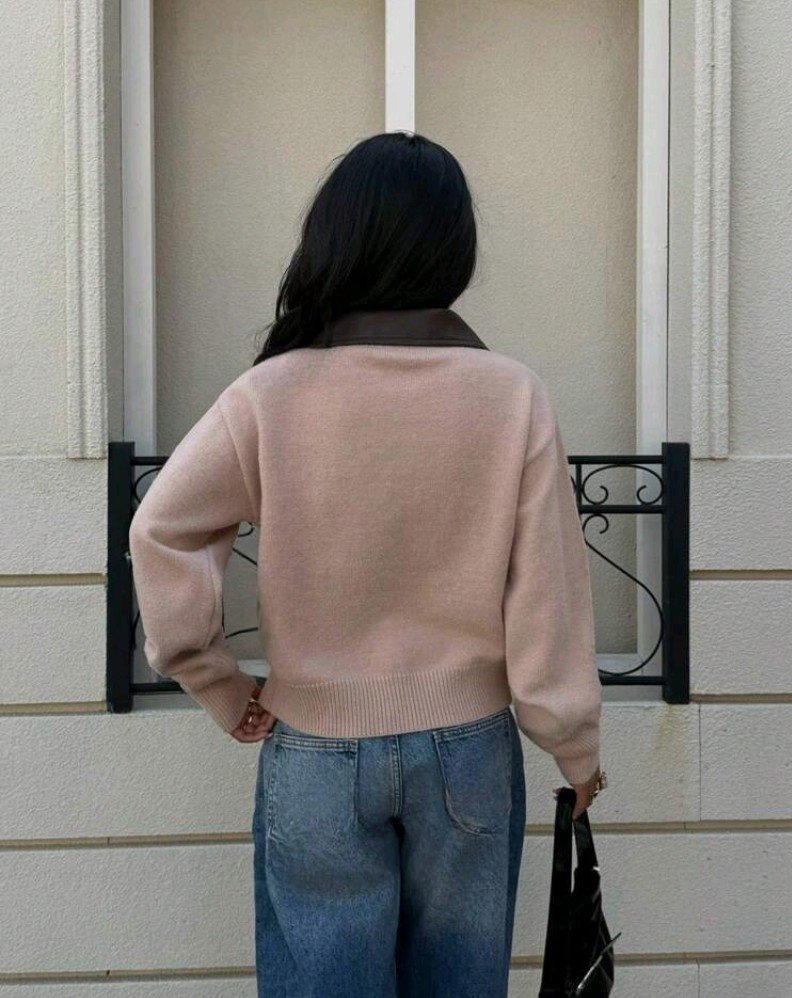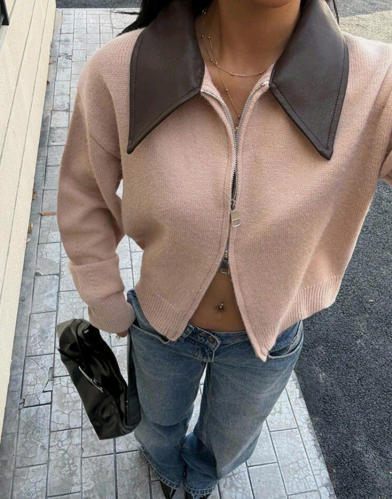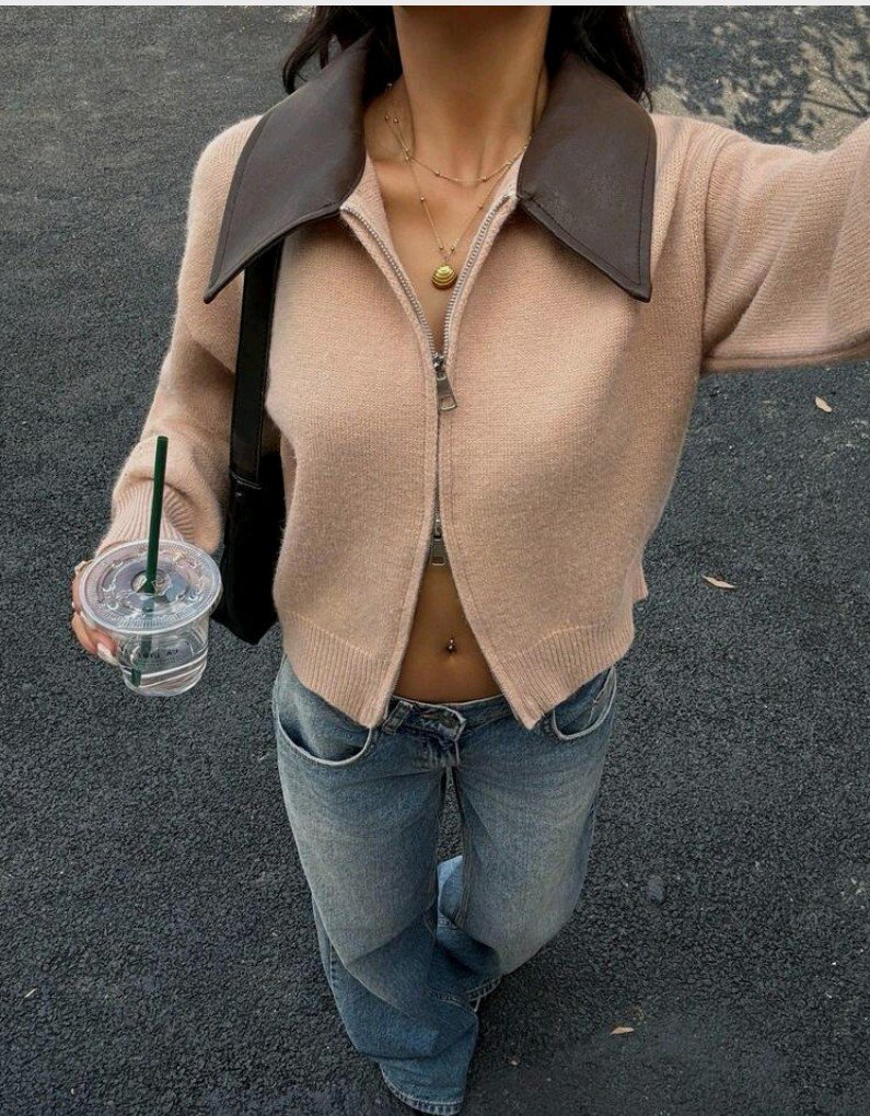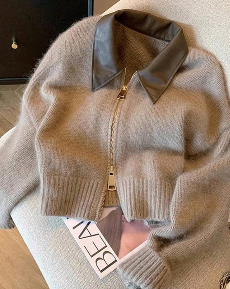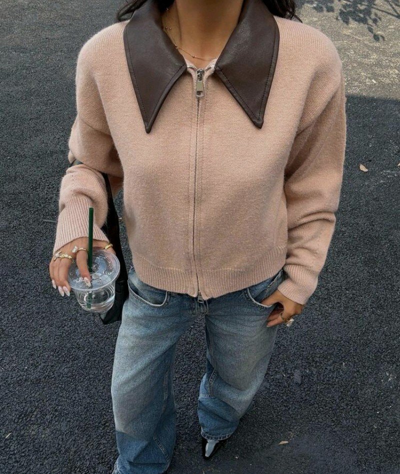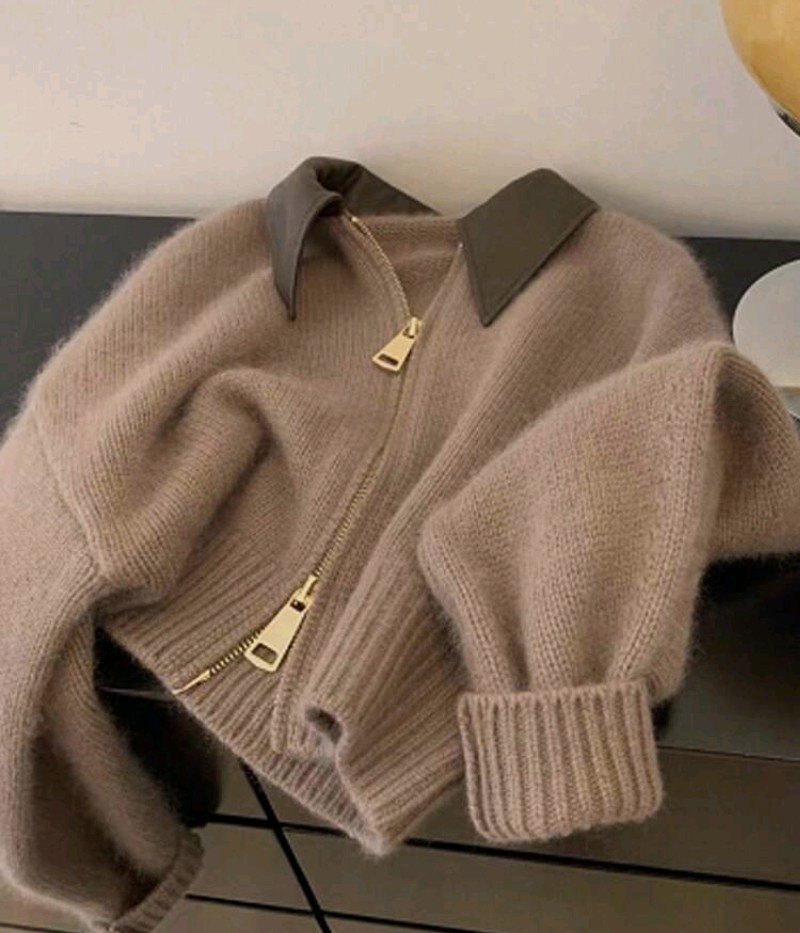 كارديجان قصير كاجوال مصنوع من الأقمشة المنسوجة، ذو ياقة بتصميم الرقعة اللون الخاكي، مزود بسحاب أمامي مزدوج، مناسب للخريف والشتاء للنساء