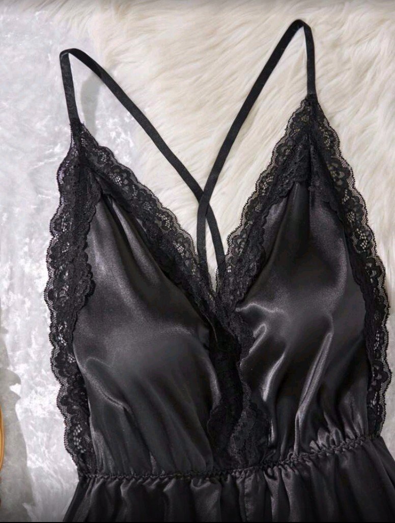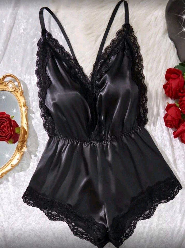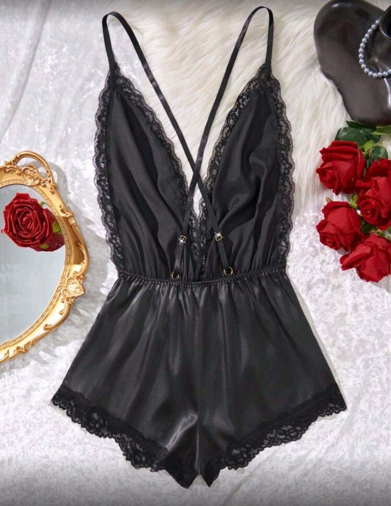 + Free Shippingجمبسوت ستاتي مثير مزين بالدنتيل الاسود فتحة صدر على شكل حرف V عميق ظهر مكشوف اشرطه متقاطعه