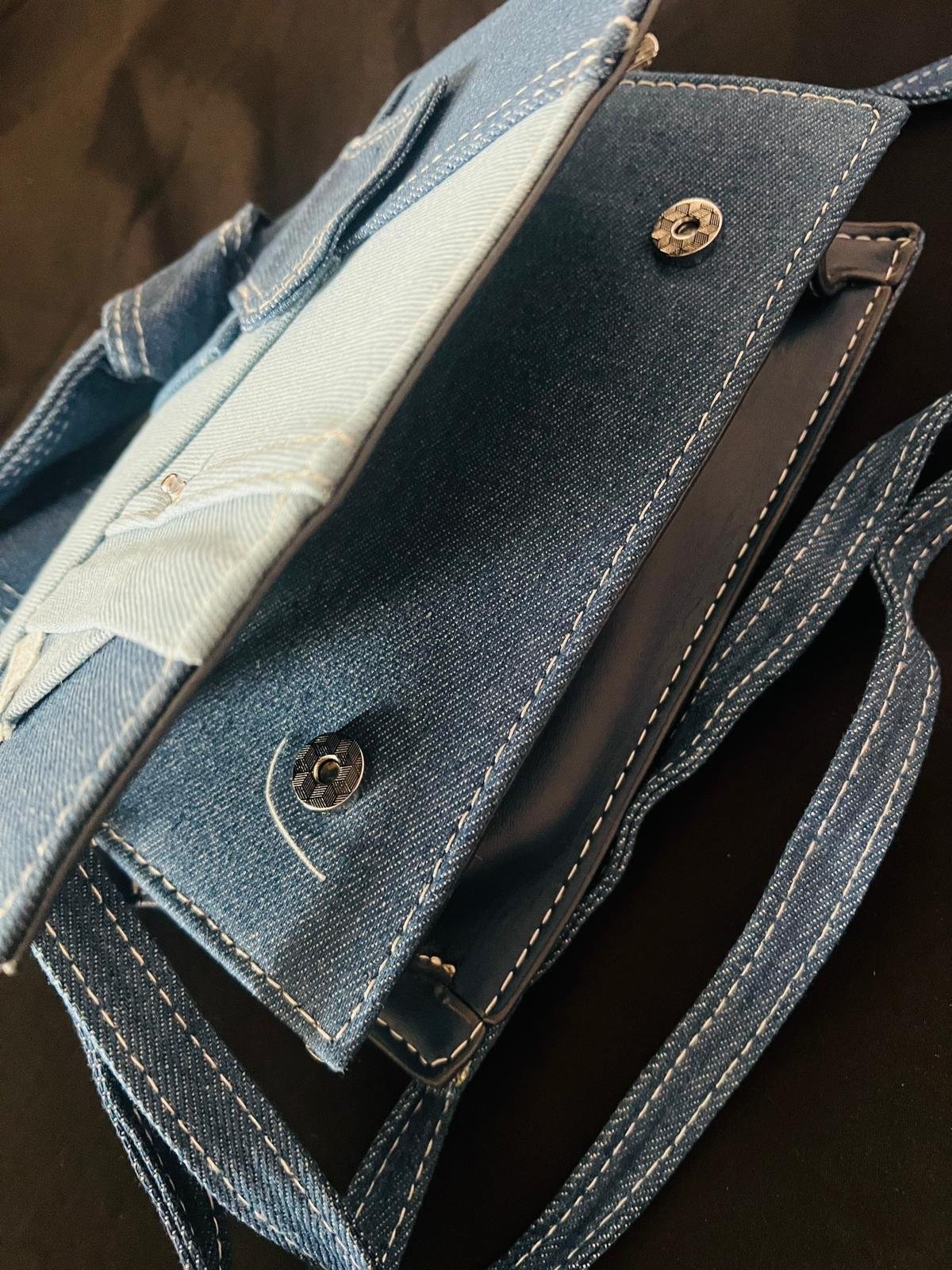 + Free Shippingحقيبه جميله عصريه من قماش الجينز والجلد باطلاله عصريه مع حزام للتحكم في الطول كحقيبة كتف وحقيبة يد