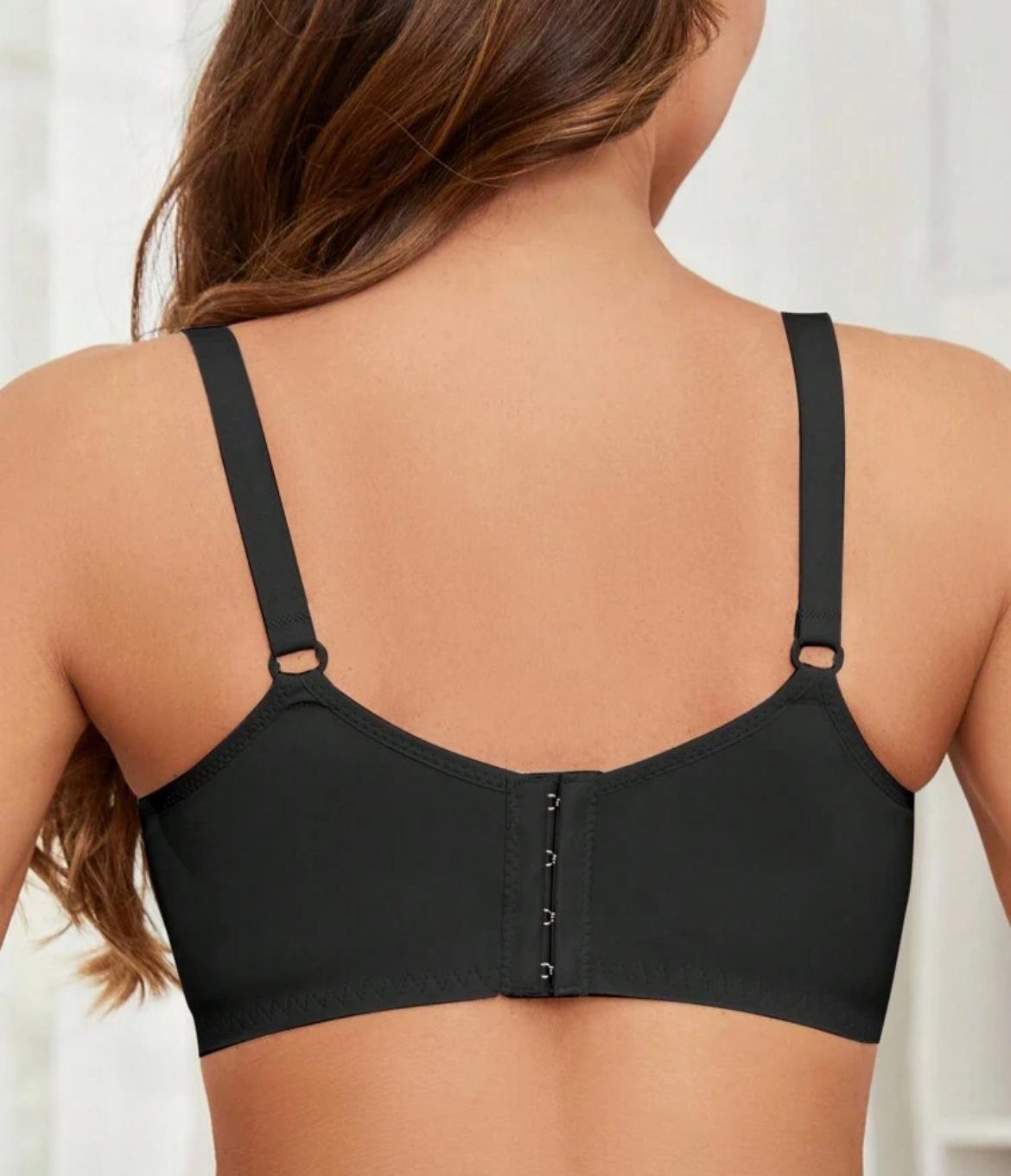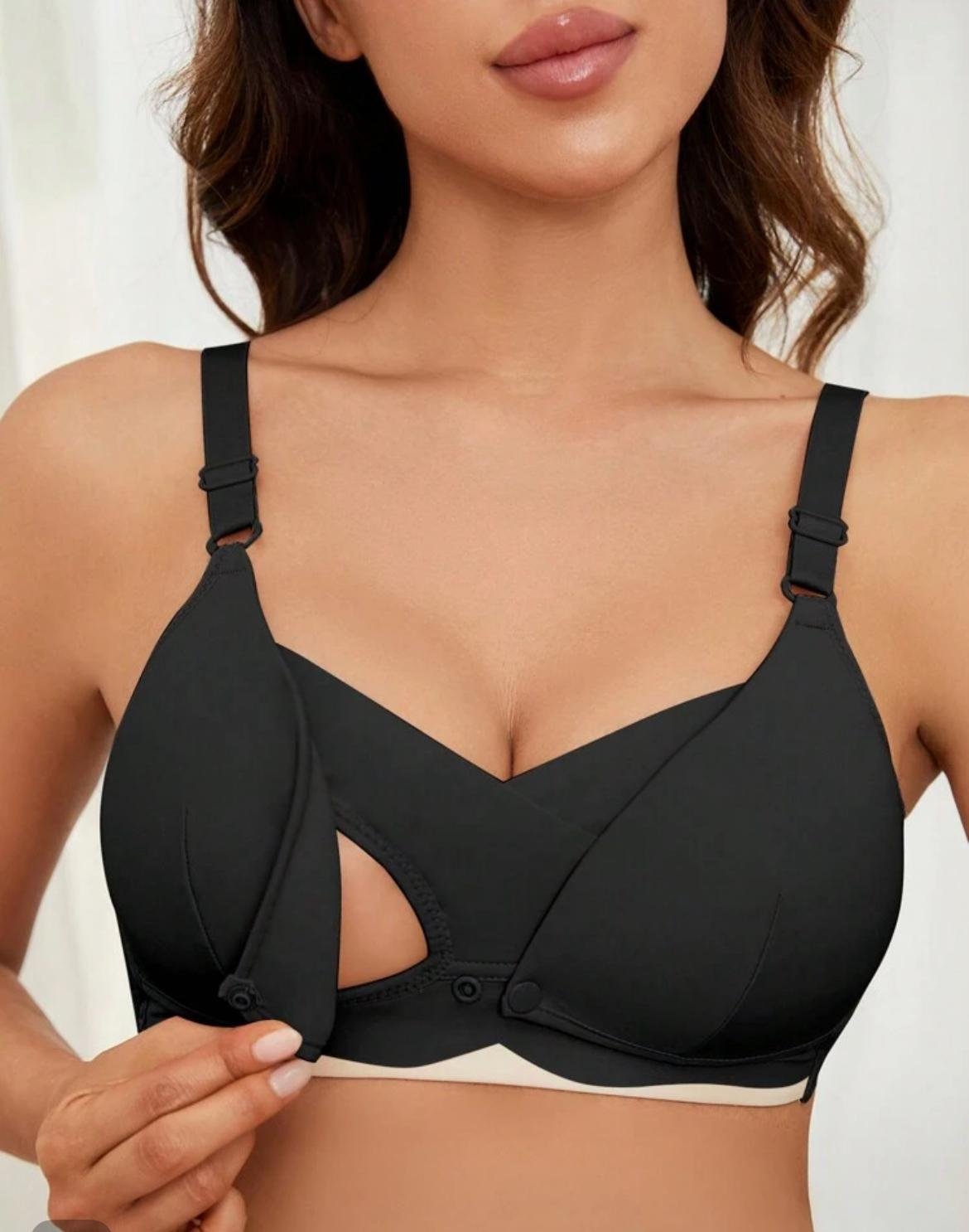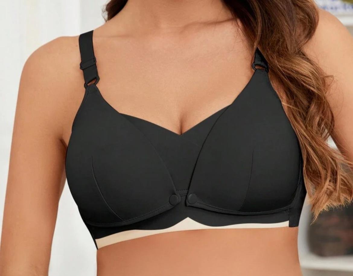 حمالة صدر نسائية غير ملحومة بلون فاتح للرضاعة الطبيعية، ناعمة ومريحة، مع حشوة غير قابلة للإزالة، وأشرطة قابلة للتعديل، تصميم بسيط وأنيق، تتميز بإغلاق أمامي مرن مناسب للأمهات الذين يرضعون أطفالهن.
