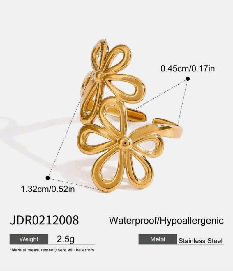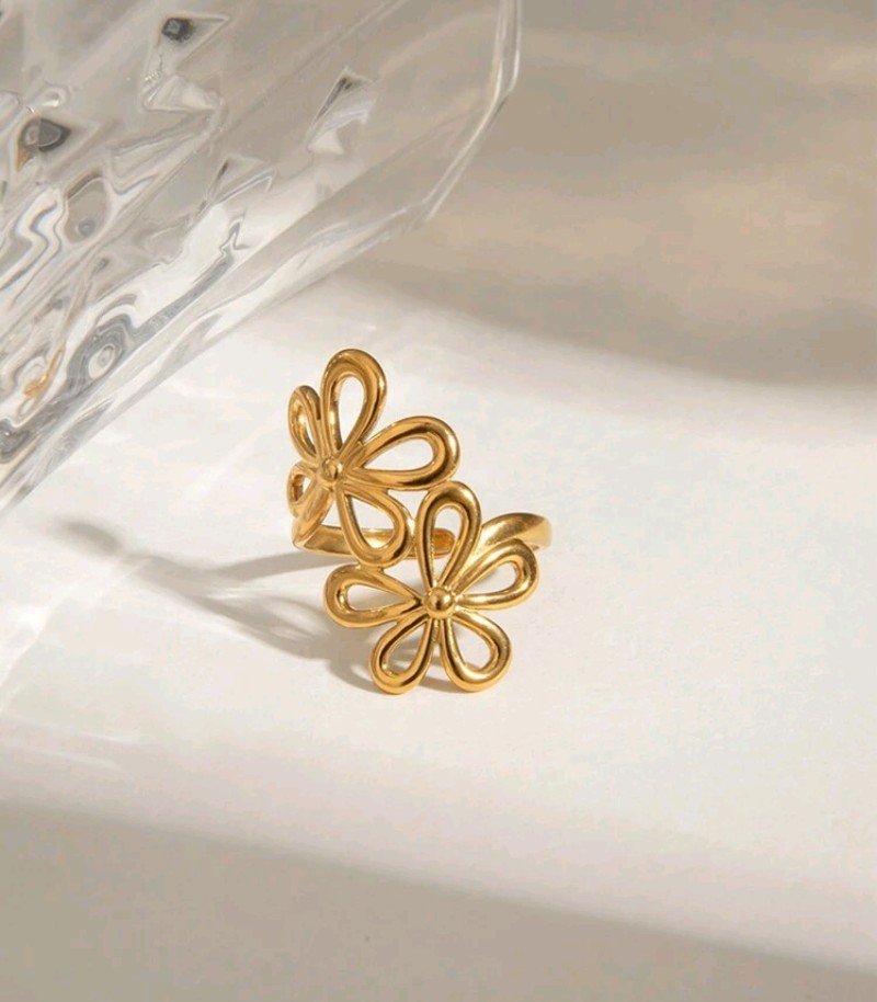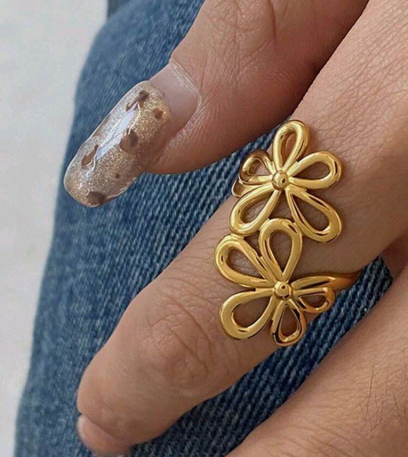 قطعة خاتم أساسي أنيق للنساء، مطلي بالذهب عيار 18 قيراط من الفولاذ المقاوم للصدأ، بتصميم مزخرف بالأزهار المفرغة، مناسب للارتداء اليومي للذهاب إلى العمل أو المدرسة أو الحفلات والمناسبات