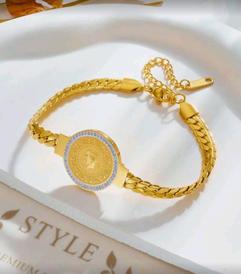 سوار واحد من الفولاذ المقاوم للصدأ مطلي بالذهب، بسلسلة معدنية مطلية بالذهب.