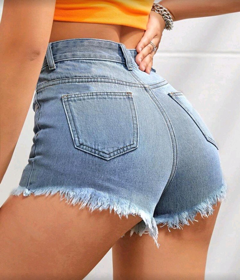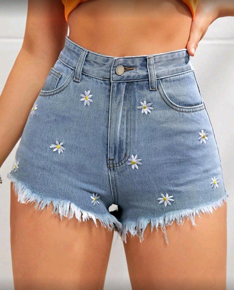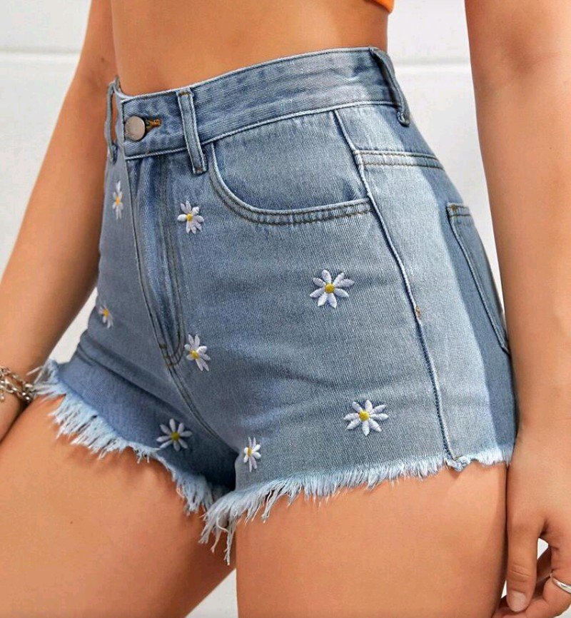 شرط جينز مطرز بحافه غير مخيطه مزين بنقشة الزهور