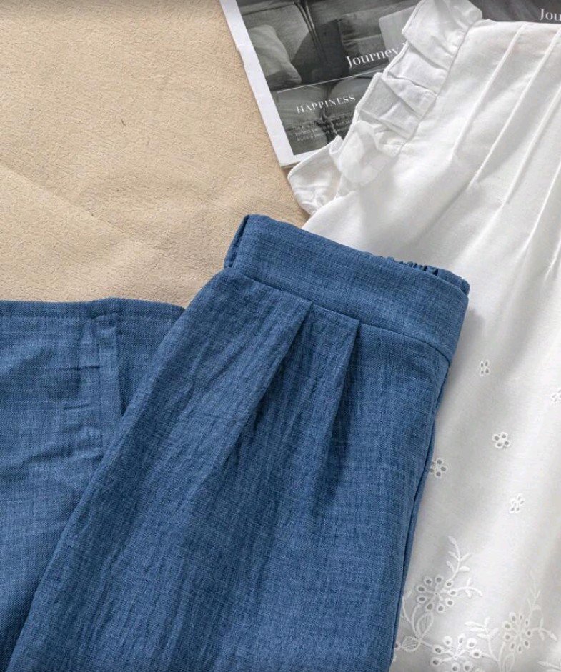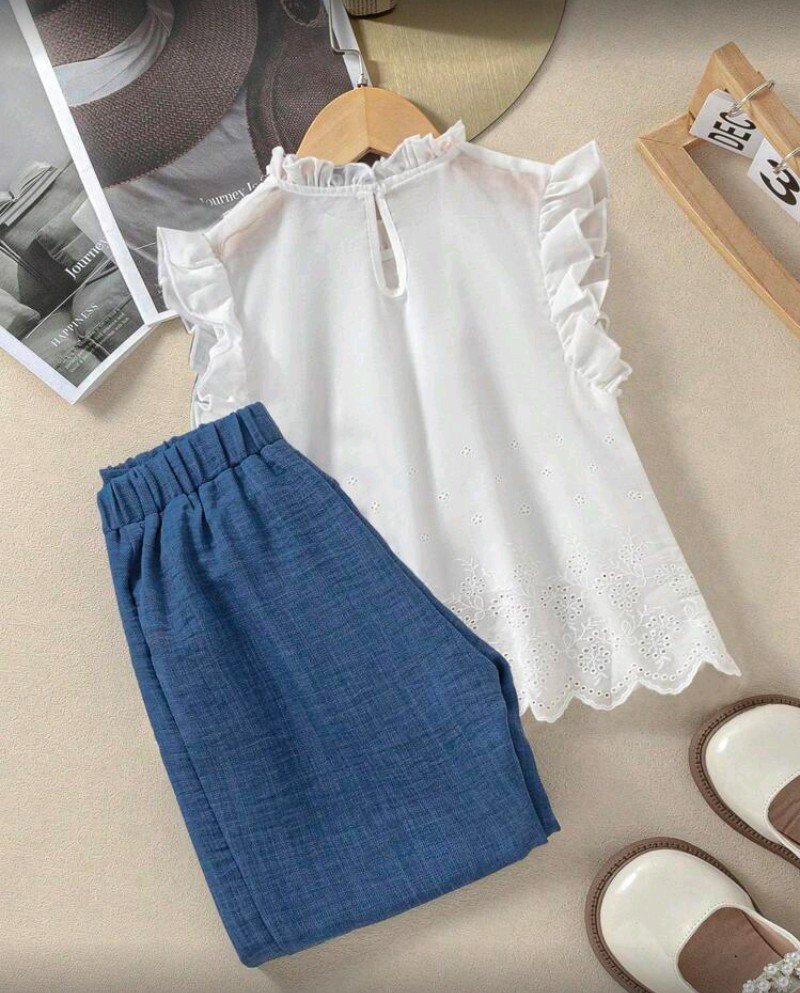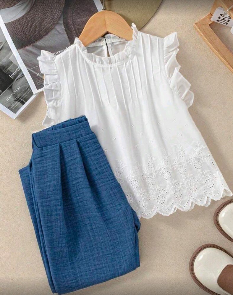 طقم مكون من قطعتين للبنات الصغيرات، بلوزة وبنطال بدون أكمام بلون موحد، تصميم بسيط وعصري