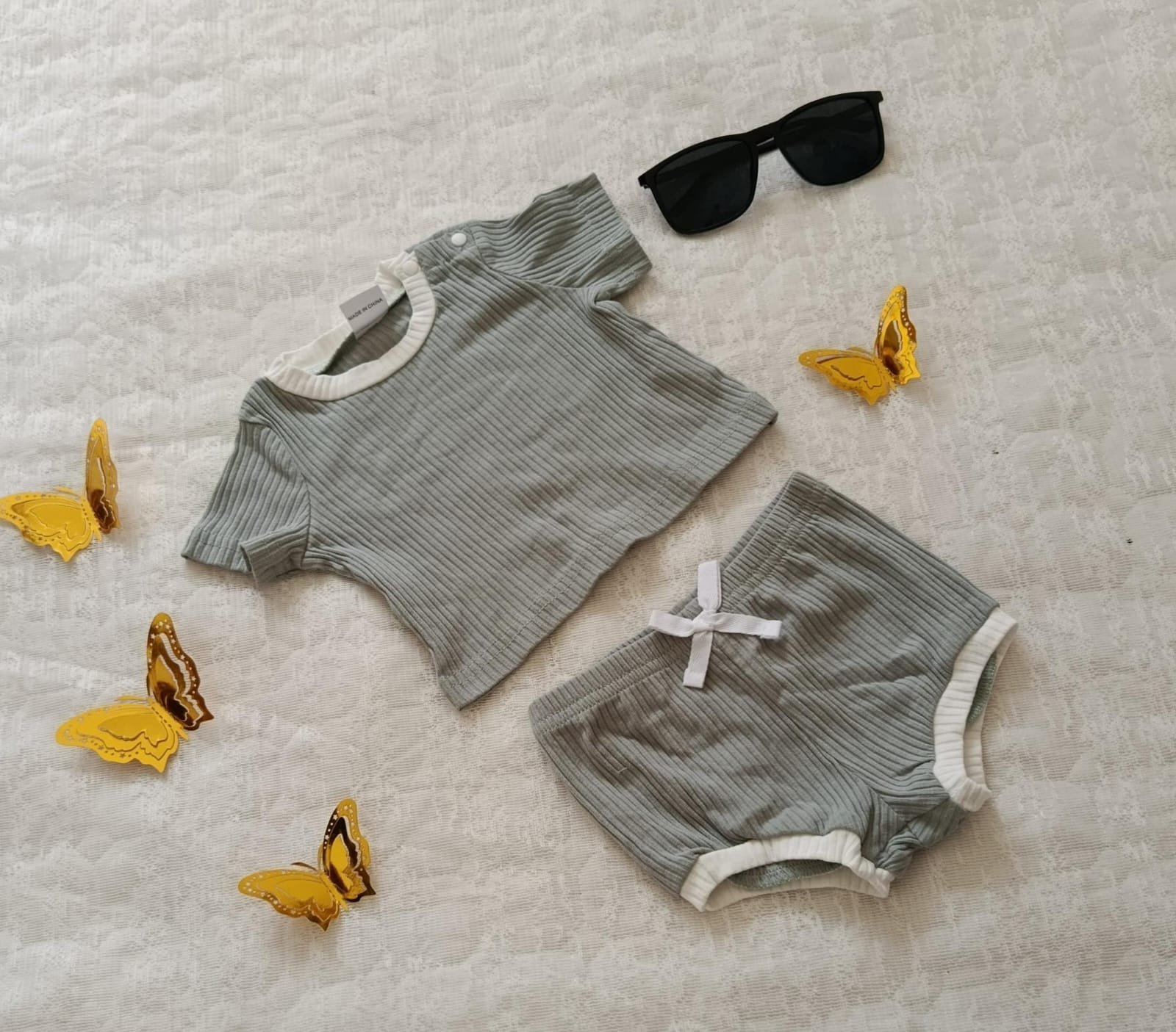 طقم صيفي جديد للبنات مكون من قطعتين: تي شيرت أساسي بأكمام قصيرة وشورت بفيونكة، مناسب للخروج