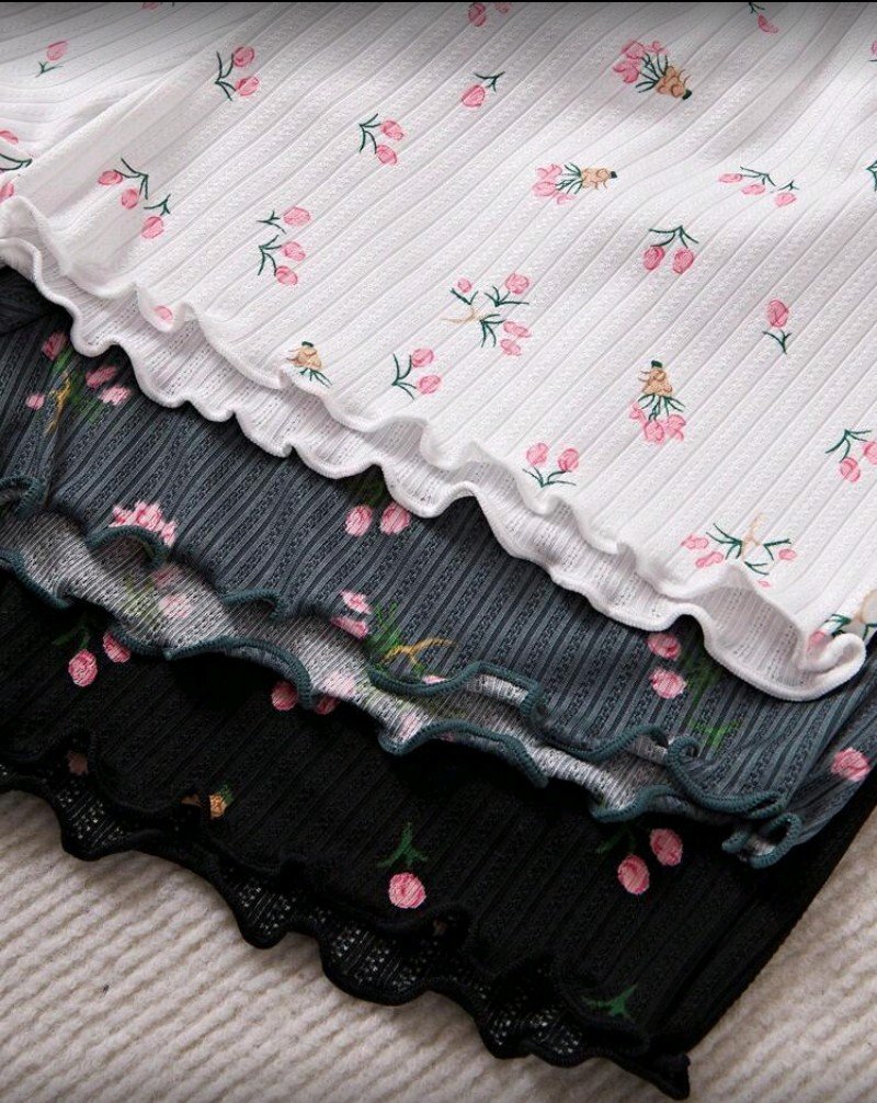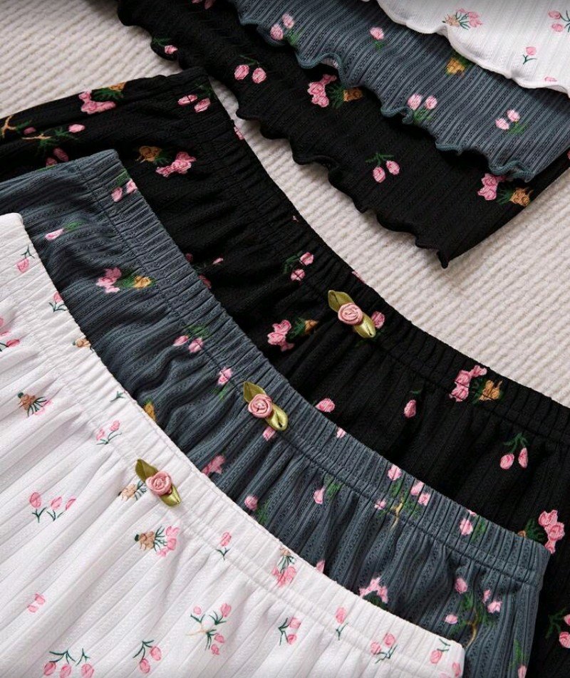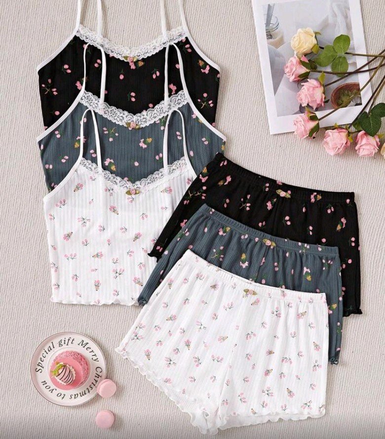 طقم ثلاث قطع بجامات بنقشة زهور روعه بصريه وتفاصيل مريحه