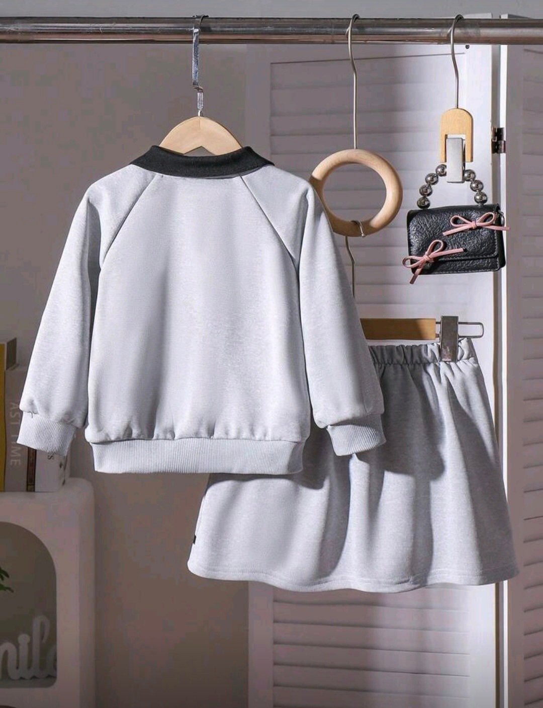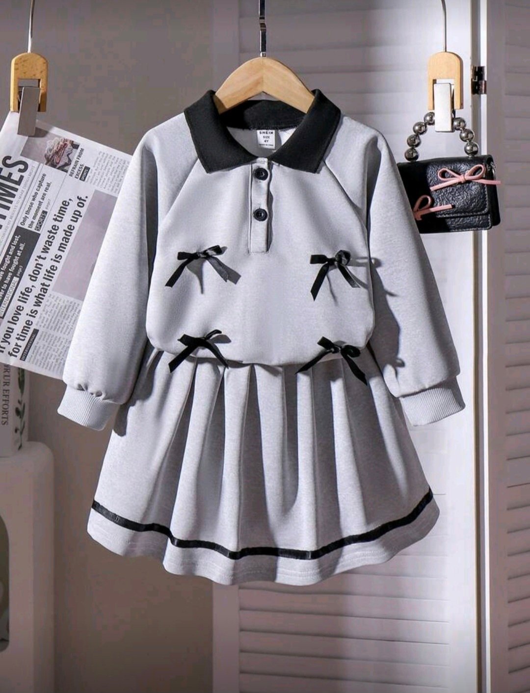 ملابس اطفالطقم مكون من قطعتين للفتيات الصغيرات سويت شيرت وتنورة بياقه مزينه بوردة الفيونكه الجميله