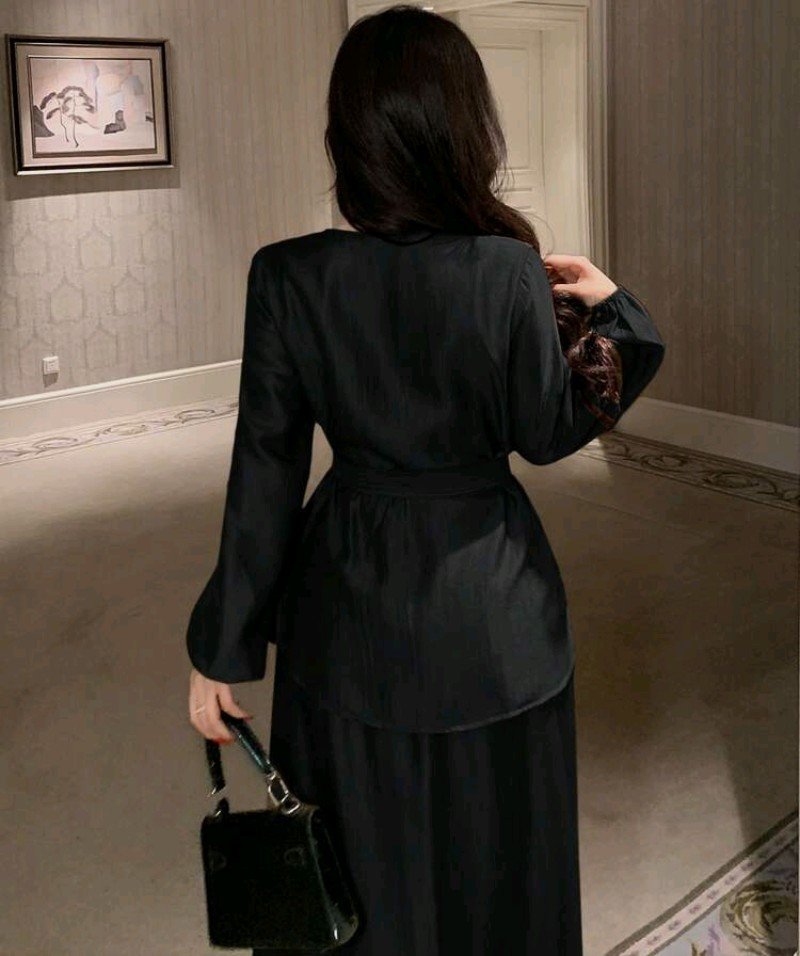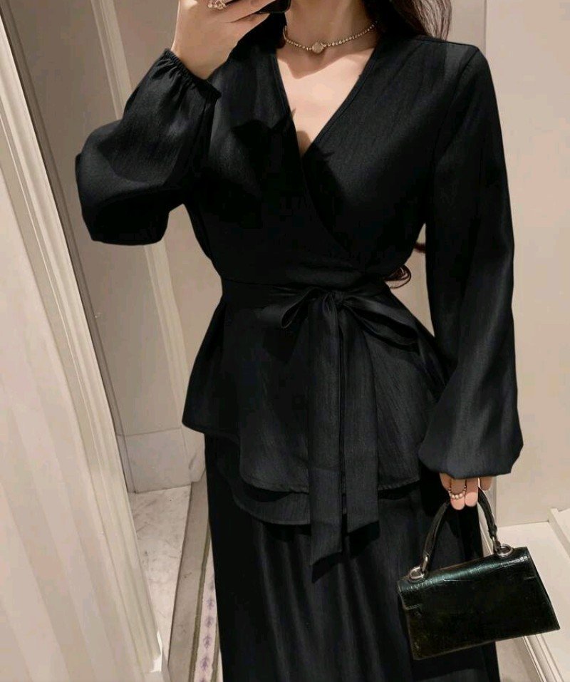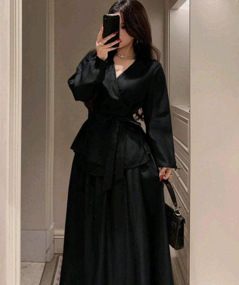 DAZY طقم بلوزة وتنورة أنيقة للنساء، لون أحادي الصدر على شكل حرف V مع حزام، مجموعة قطعتين، للربيع والصيف