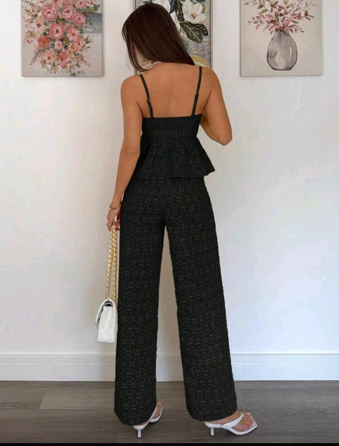 ملابس نسائيةطقم ستاتي مكون من قطعتين باللون الاسود السادة