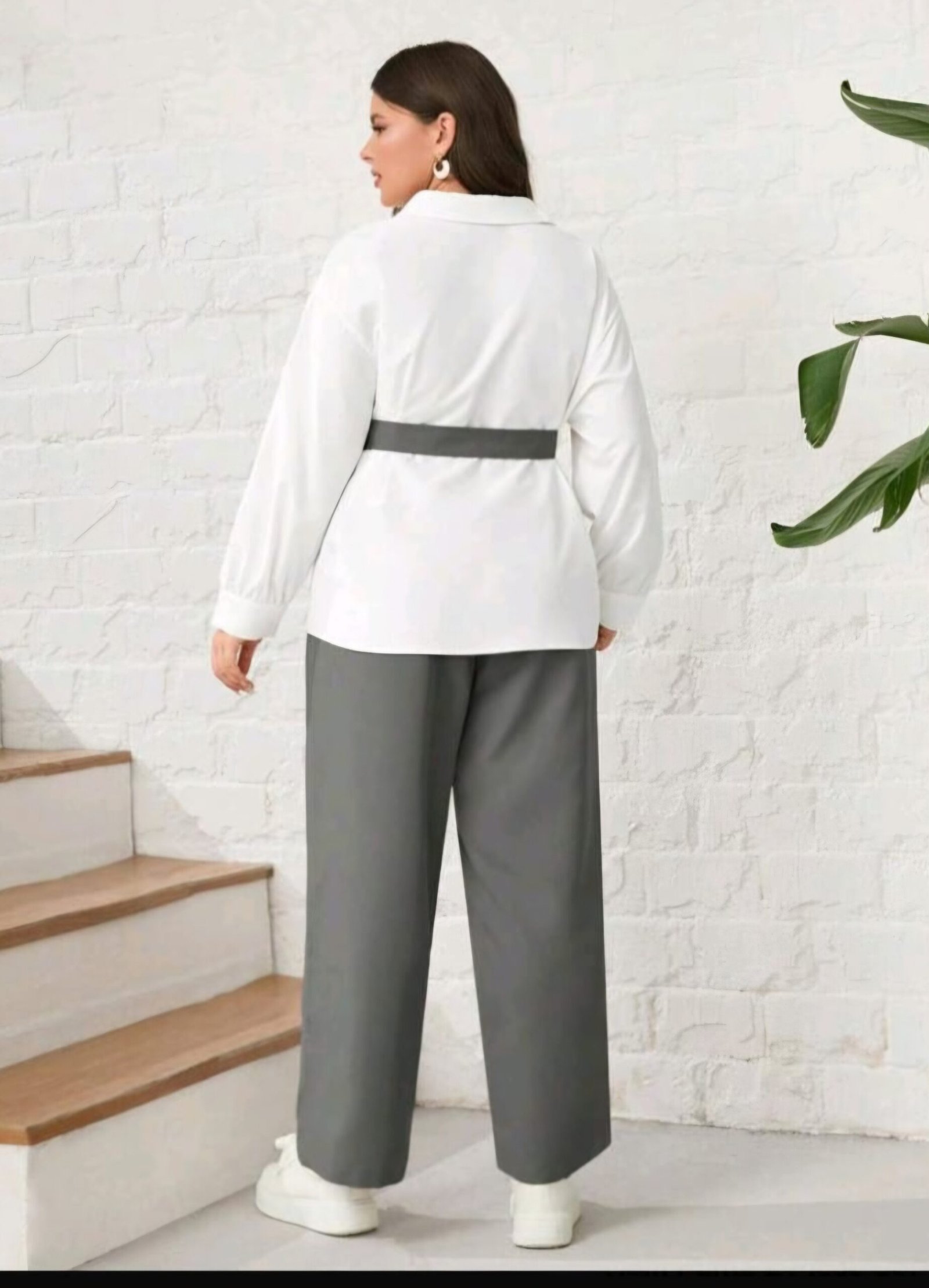 + Free Shippingمجموعة من قطعتين من بلوزة مولفاري بلس بحزام وبنطال بحاشية مقسمة