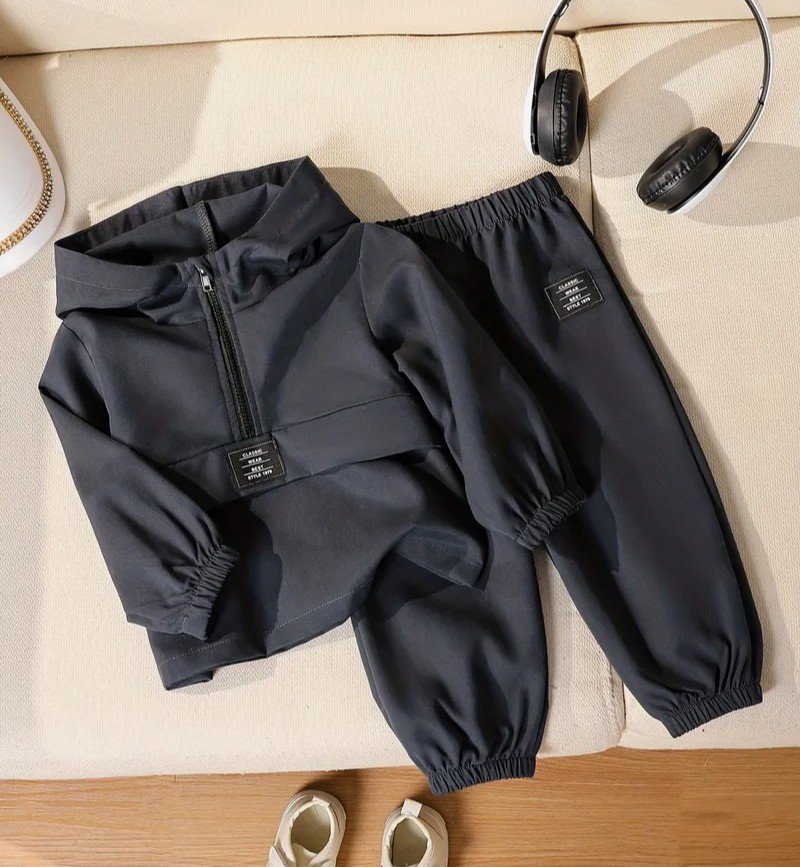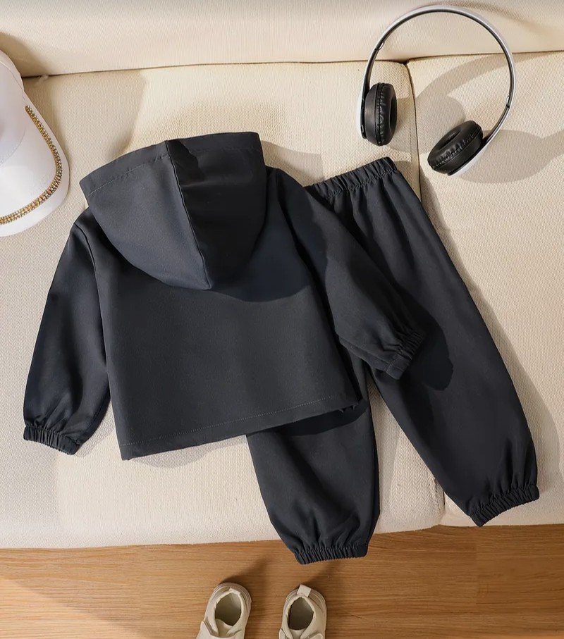 2 قطعة بدلة طويلة الأكمام للأولاد: قميص بقلنسوة زهور بلون سادة + بنطلون برباط، ملابس مريحة وعصرية للخارج