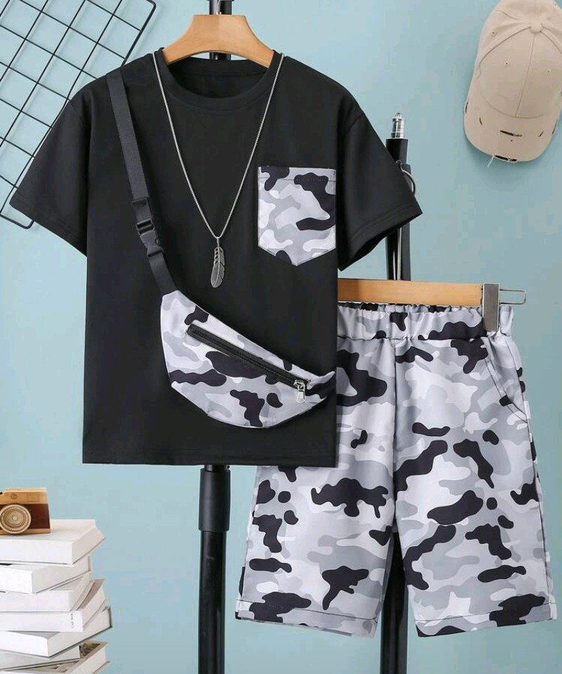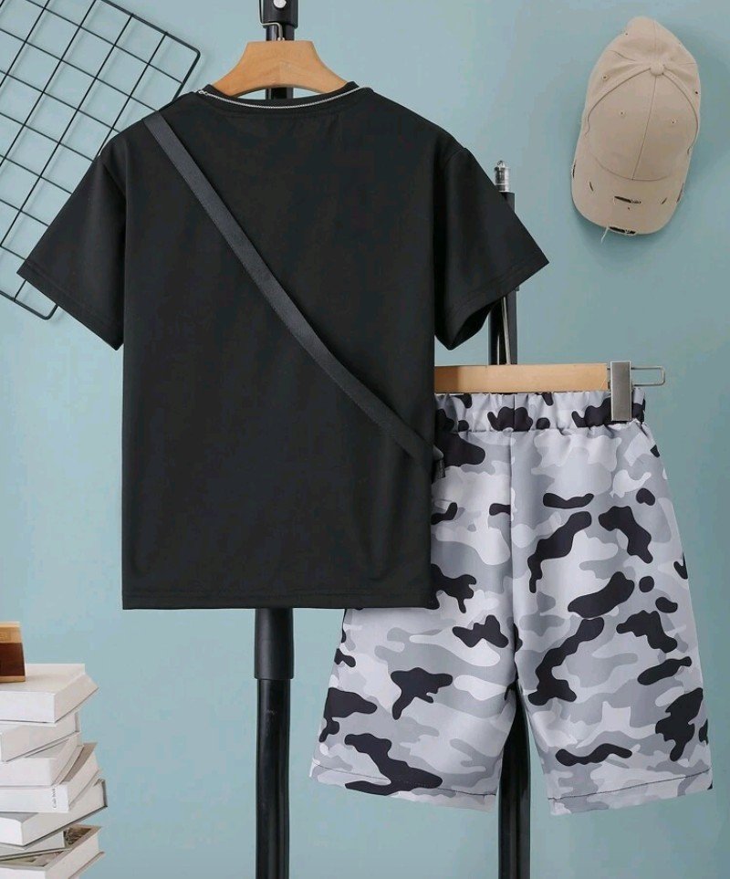 طقم شورت كاموفلاج للأولاد + حقيبة + بلوزة