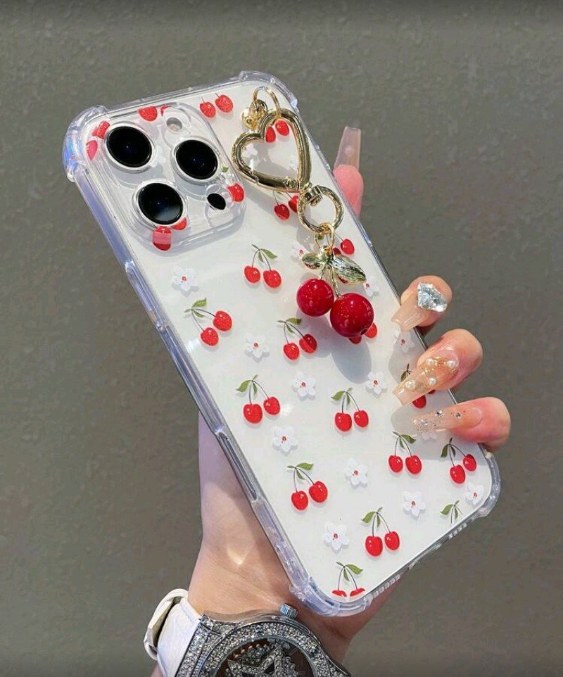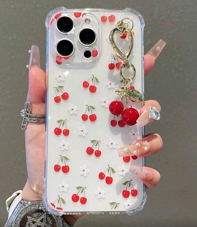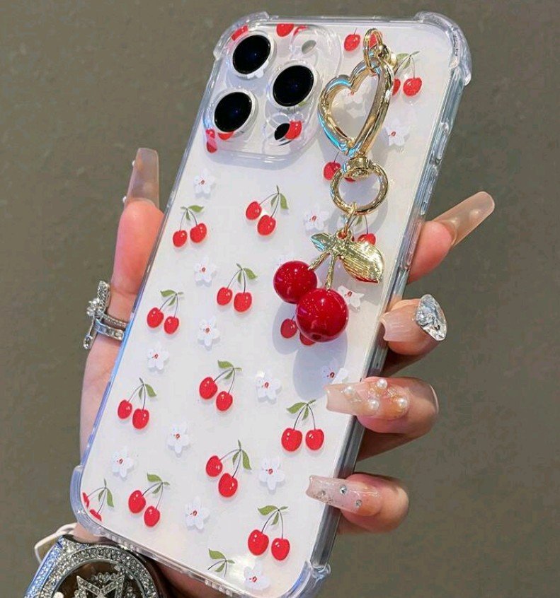 + Free Shippingغطاء حماية شفاف بلون موحد للهاتف، مزين بنقشة كرز لطيفة وقلادة على شكل كرز، متوافق معiphon 12 pro max
