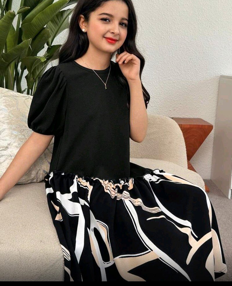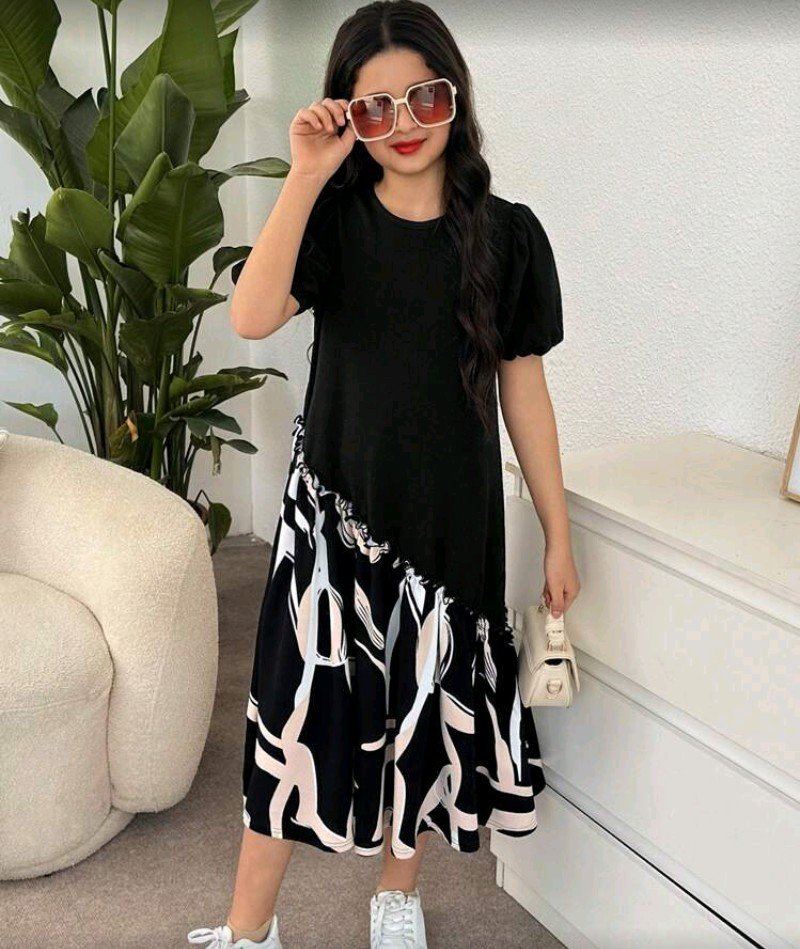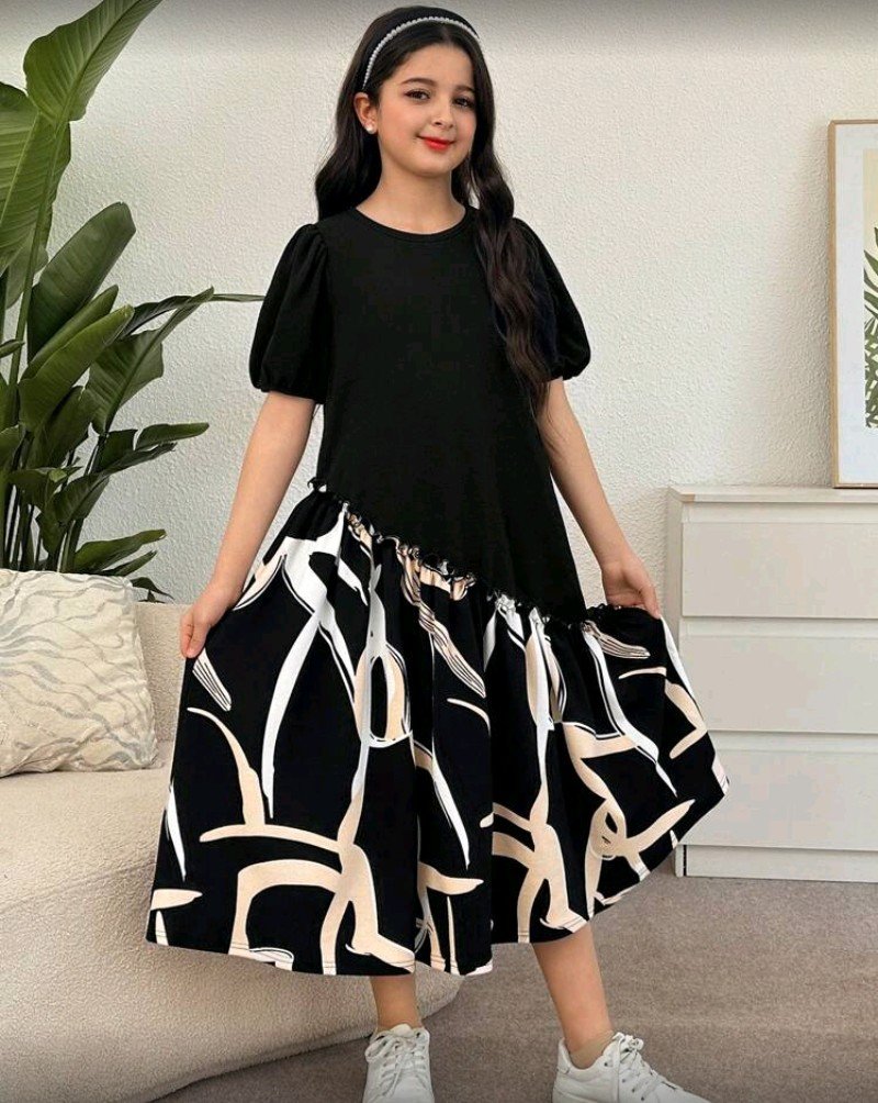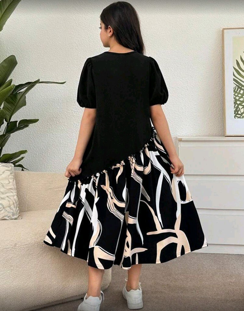 + Free Shippingفستان بناتي كاجوال بأكمام قصيرة وطول متوسط مع نقشة هندسية.