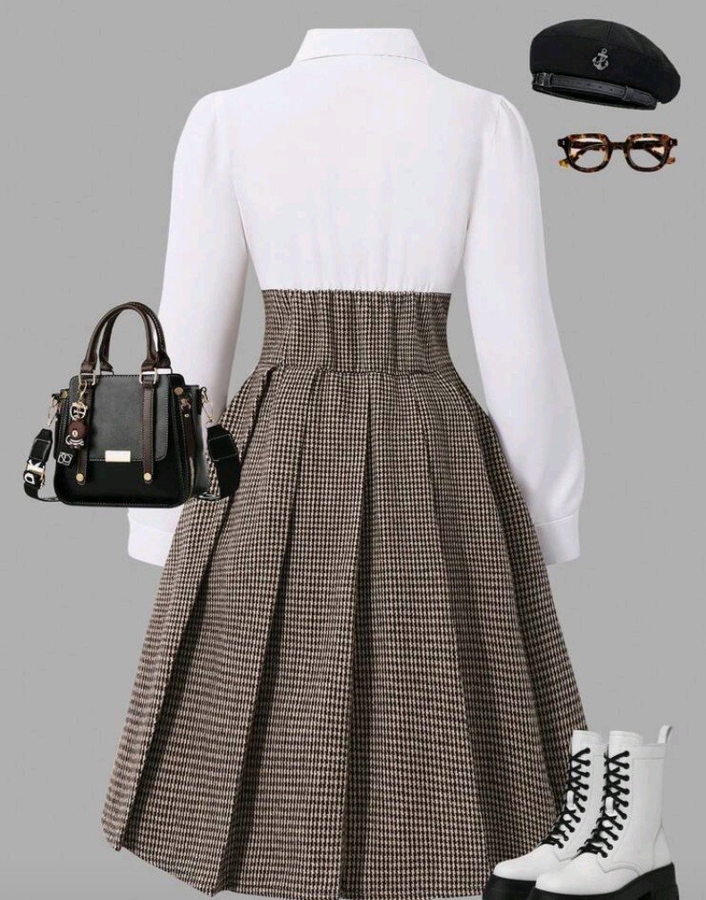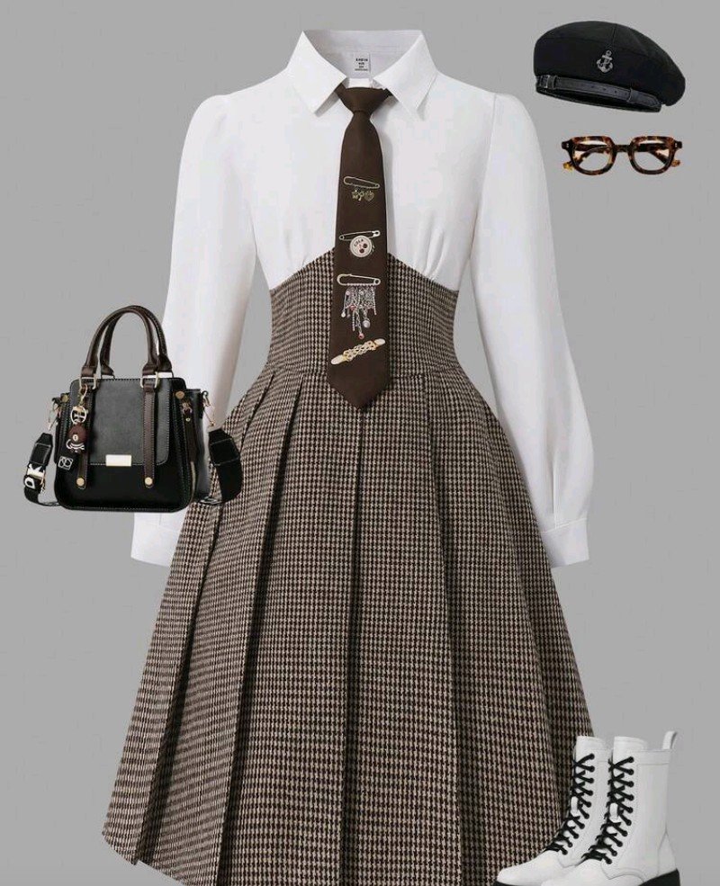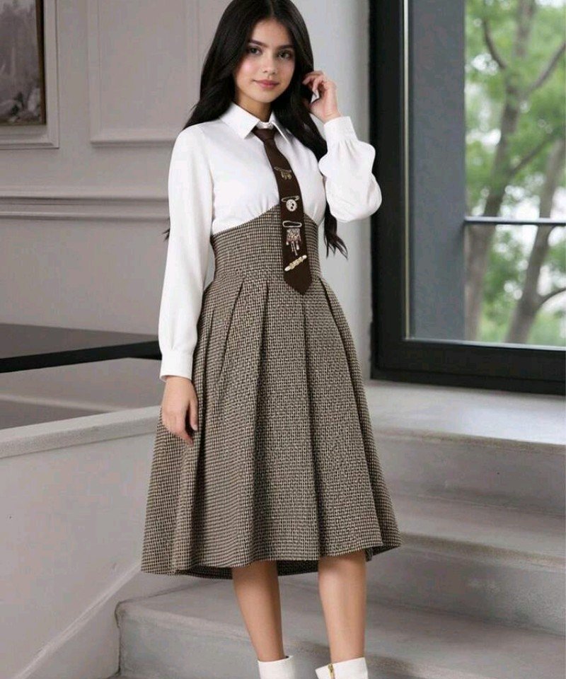 فستان كاجوال بأكمام طويلة مع تصميم مرقع من نسيج الهندسي والكشكشة في الذيل للفتيات المراهقات