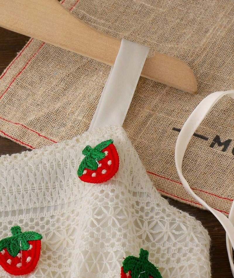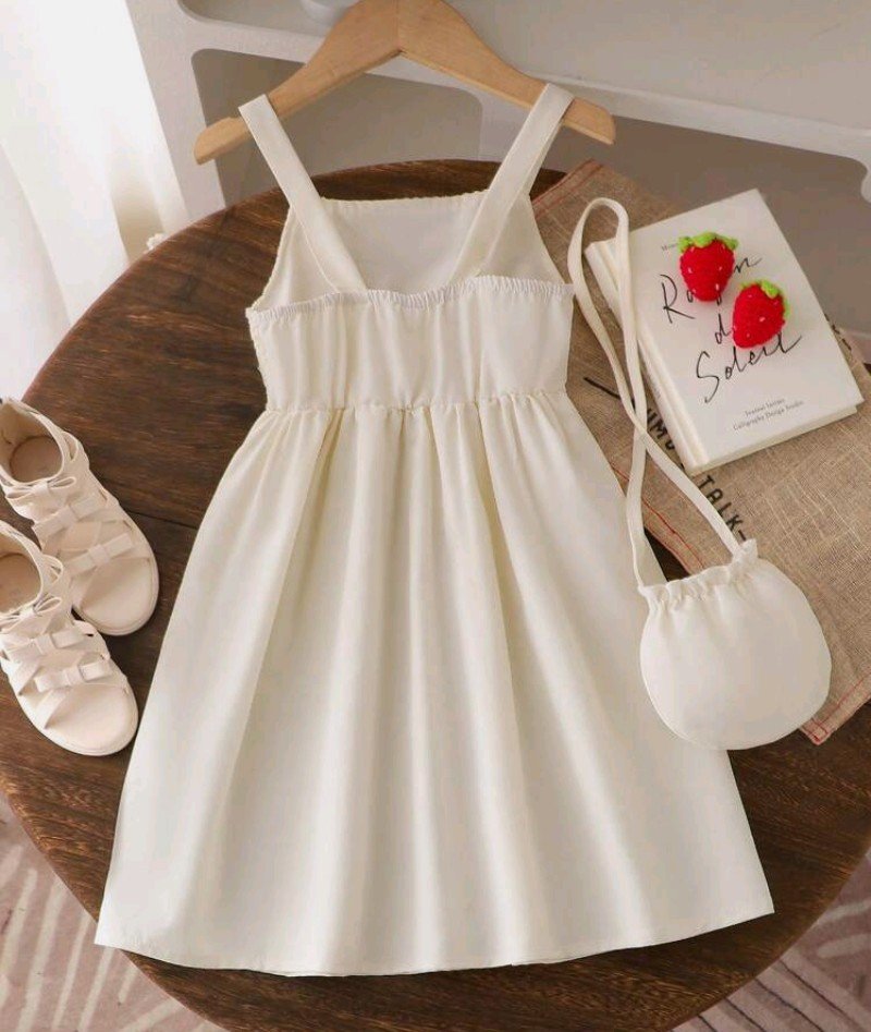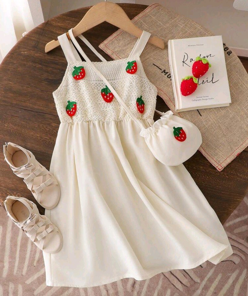 فستان صيفي للبنات بتصميم عادي للخروج اليومي، بلون سادة مع زينة فراولة وأحزمة رفيعة، بطول الركبة مع حقيبة متناسقة