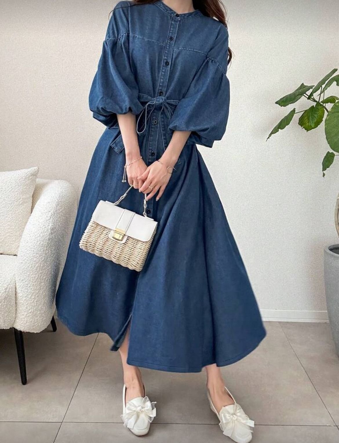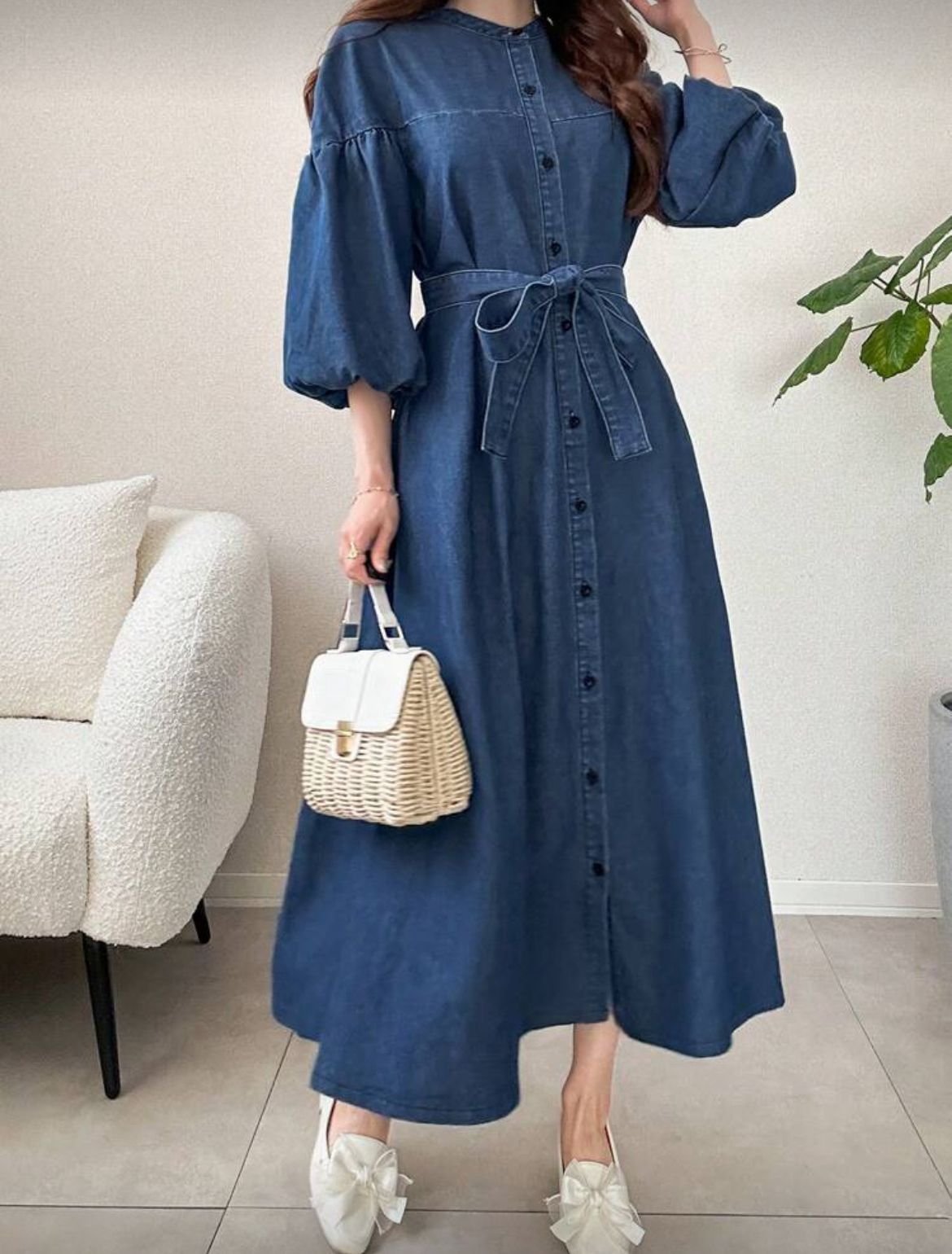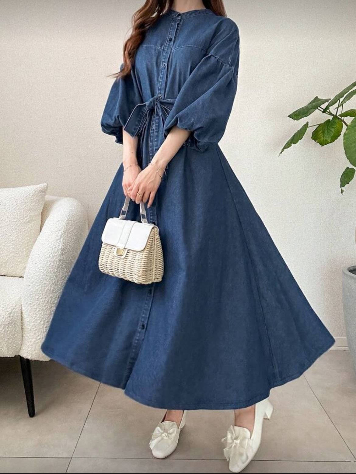 + Free Shippingفستان جينز نسائي كاجوال بتصميم أزرار وأكمام واسعة، ملابس نسائية، ملابس صيفية نسائية، صيفية نسائية، فساتين صيفية للعمل