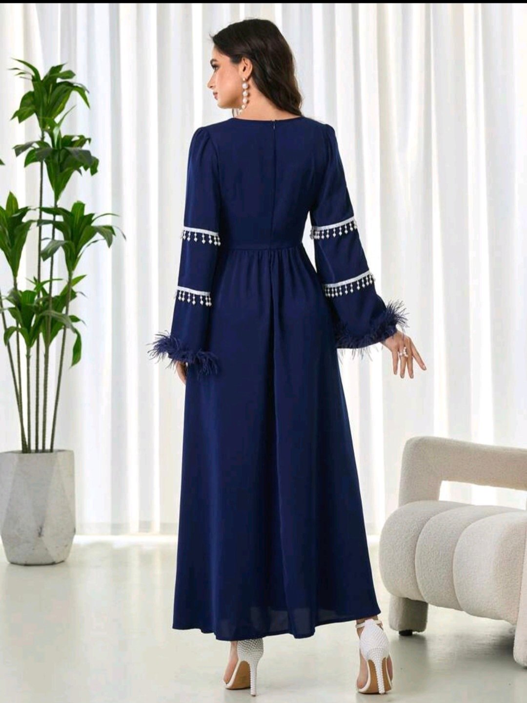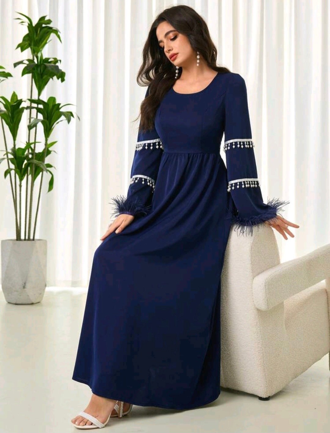 فستان ستاتي طويل بشريط لؤلؤي فستان رومانسي فاخر انيق