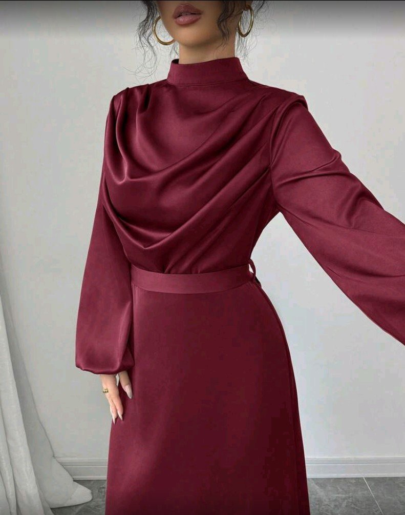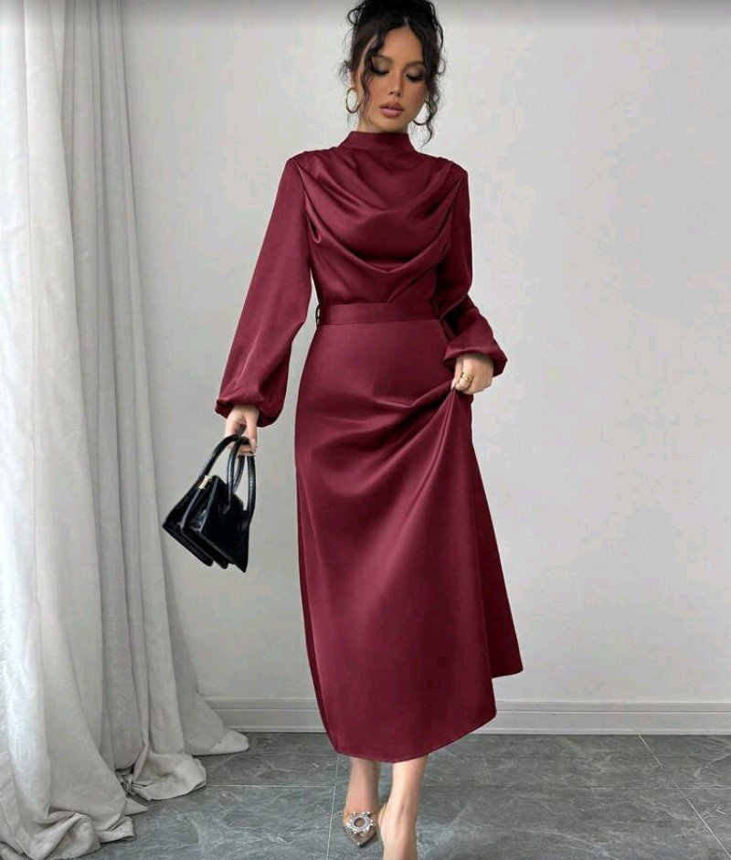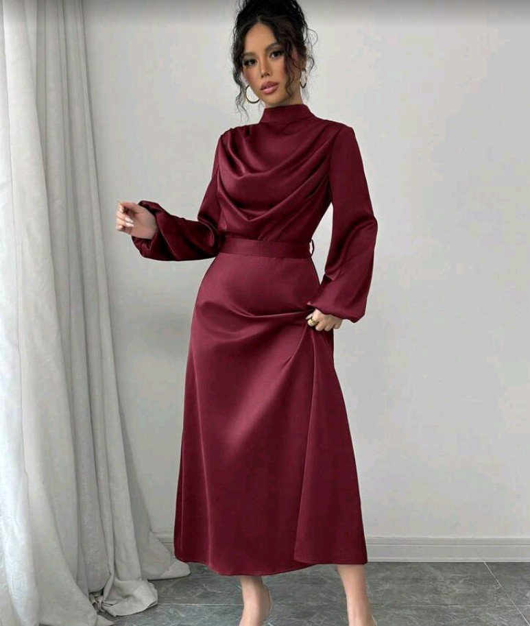 فستان نسائي بلون سادة بأكمام فانوس وياقة مدخنة، فستان ساتان طويل متدلي، فستان ضيوف الزفاف للنساء