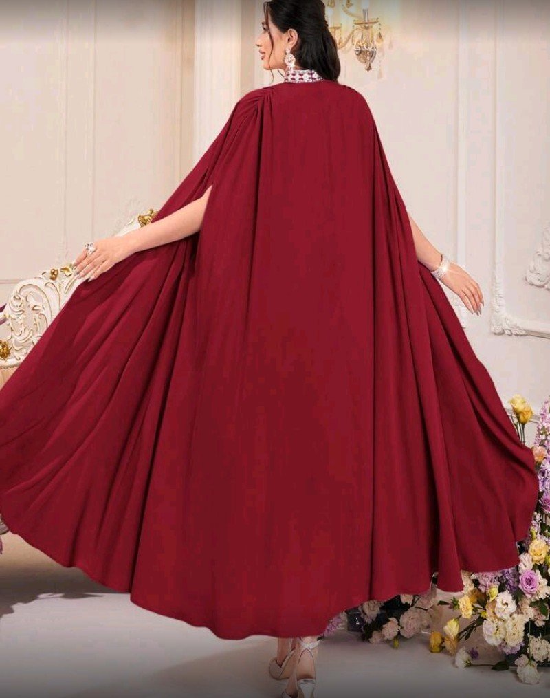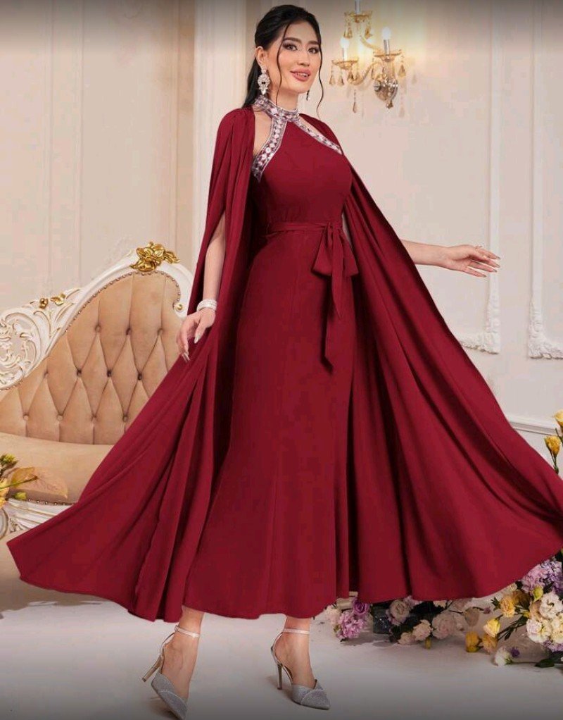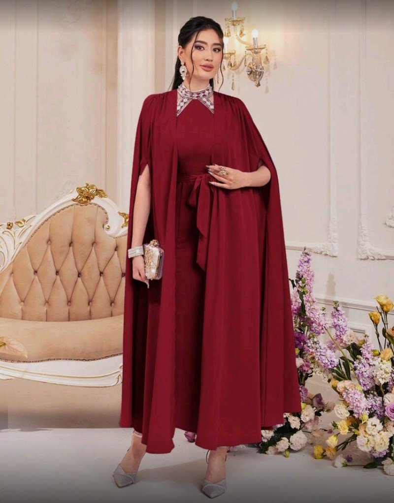 + Free Shippingطقم فستان ومعطف نسائي من موديلين، لون أحمر بورغندي سادة، مكشوف الكتفين، قطعتان